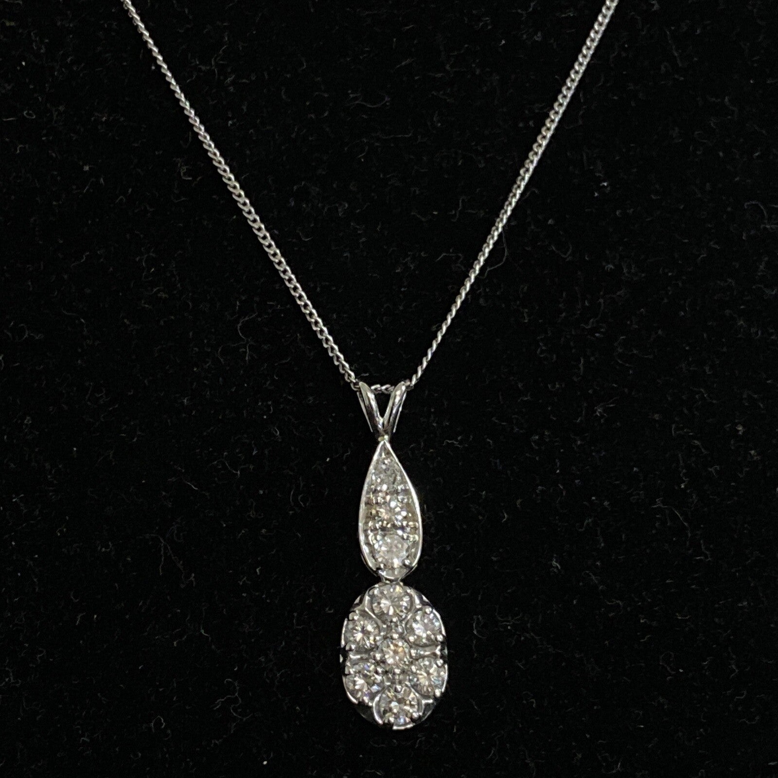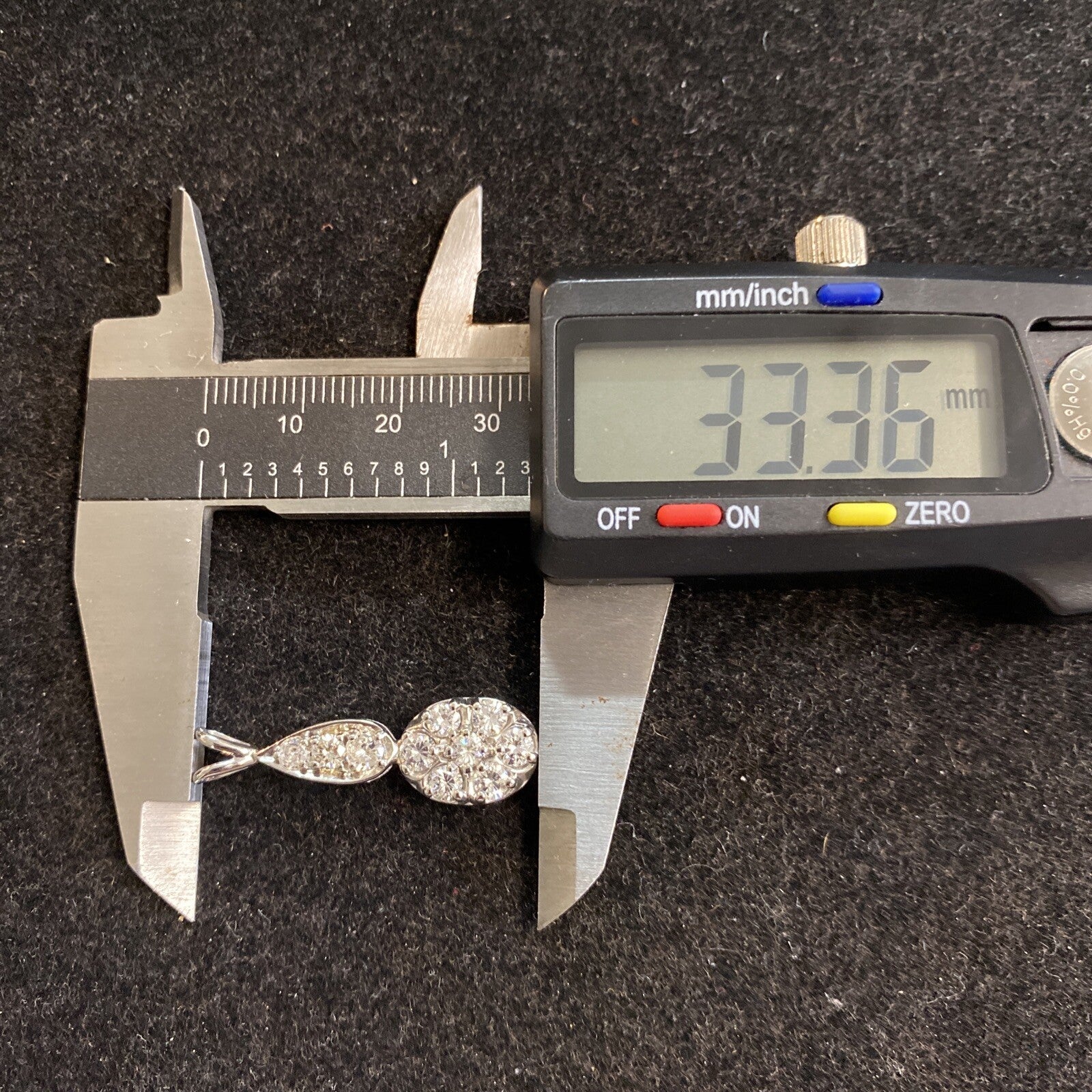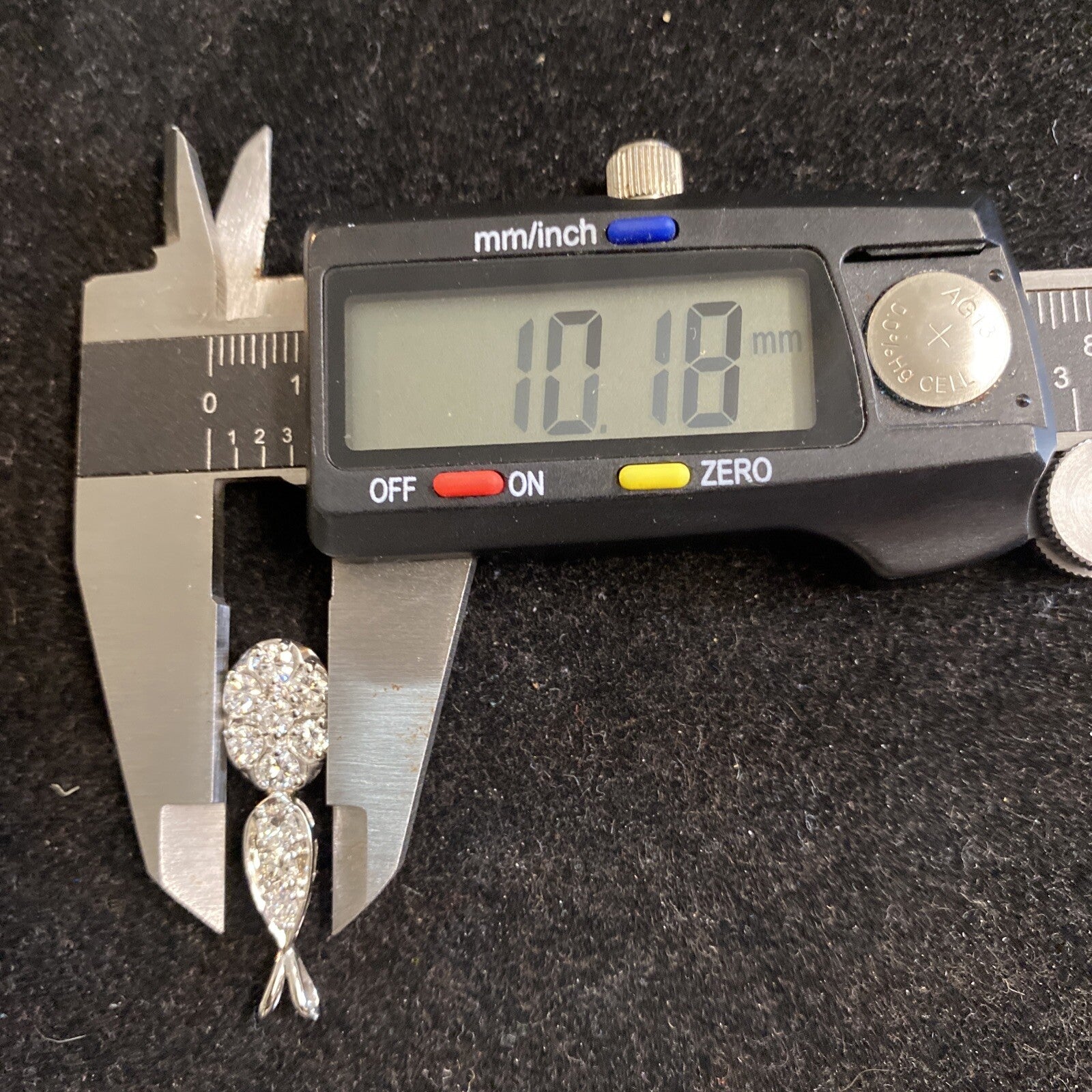 This stunning pendant features a 14K white gold base. The diamonds in total weigh approximately 1.38 carats, and a total weight of the entire pendant being 2.9 grams. The pendant is designed in a stylish manner and is perfect for any occasion. The bottom section of the pendant contains 7 round cut diamonds with a total weight of 1 carat. The top section of the pendant contains 3 round cut diamonds in various sizes, weighing approx. .10ct, .13ct, & .15ct.