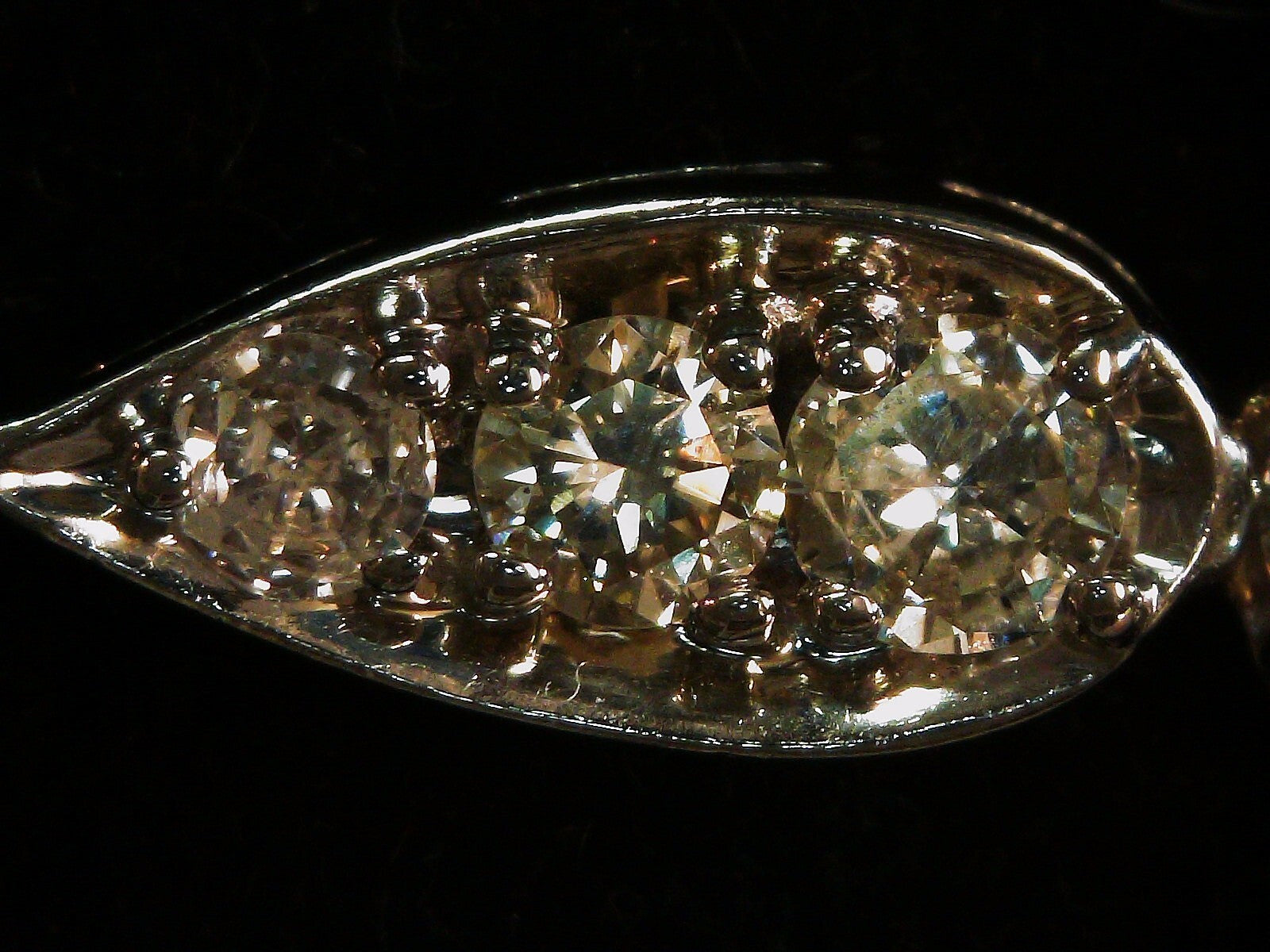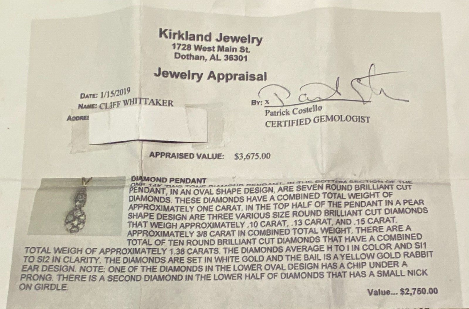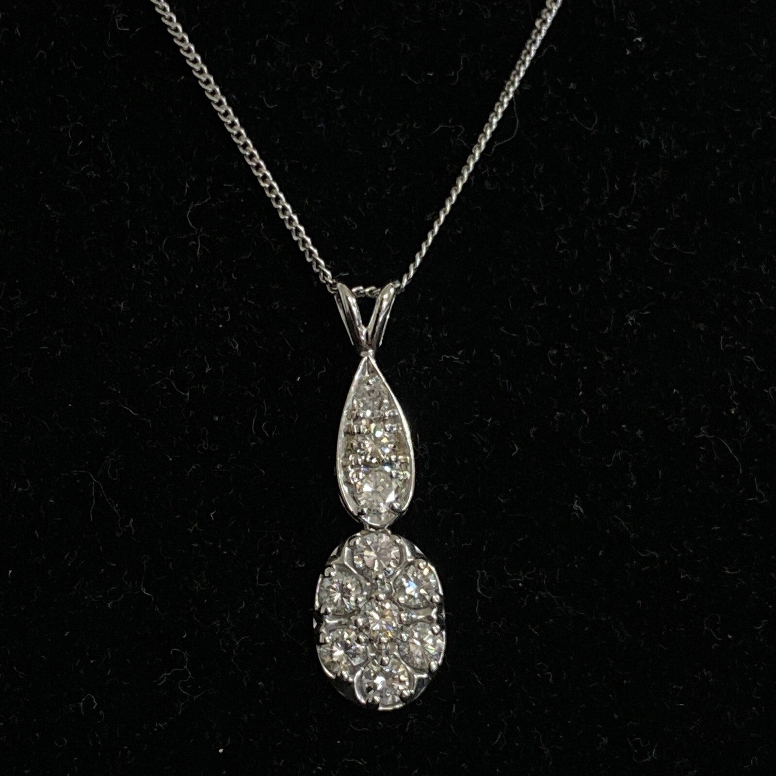 This stunning pendant features a 14K white gold base. The diamonds in total weigh approximately 1.38 carats, and a total weight of the entire pendant being 2.9 grams. The pendant is designed in a stylish manner and is perfect for any occasion. The bottom section of the pendant contains 7 round cut diamonds with a total weight of 1 carat. The top section of the pendant contains 3 round cut diamonds in various sizes, weighing approx. .10ct, .13ct, & .15ct.