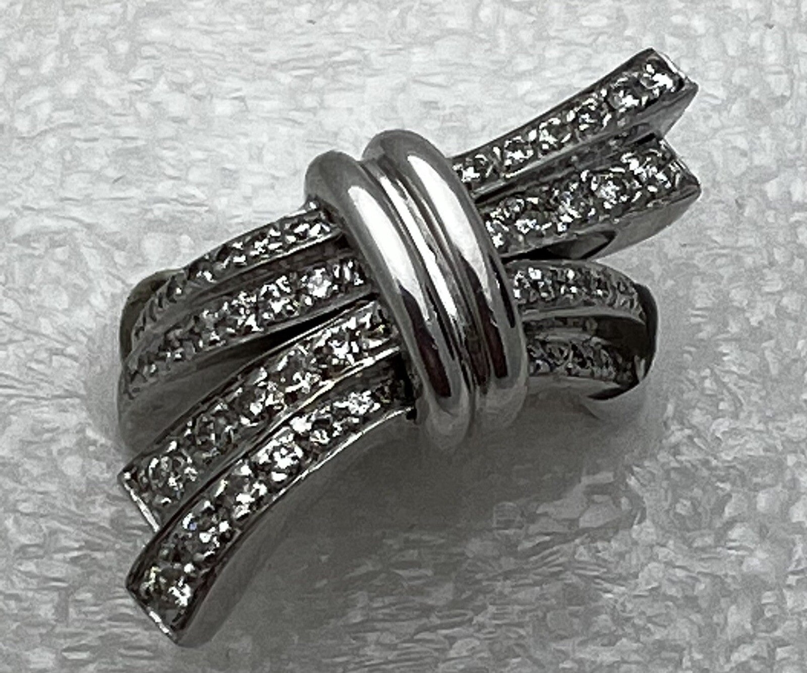 14 Carat, White Gold "Bow Tie" , small round brilliant diamonds, total weight 0.65 carats,Ring Size 7, 11.8 grams