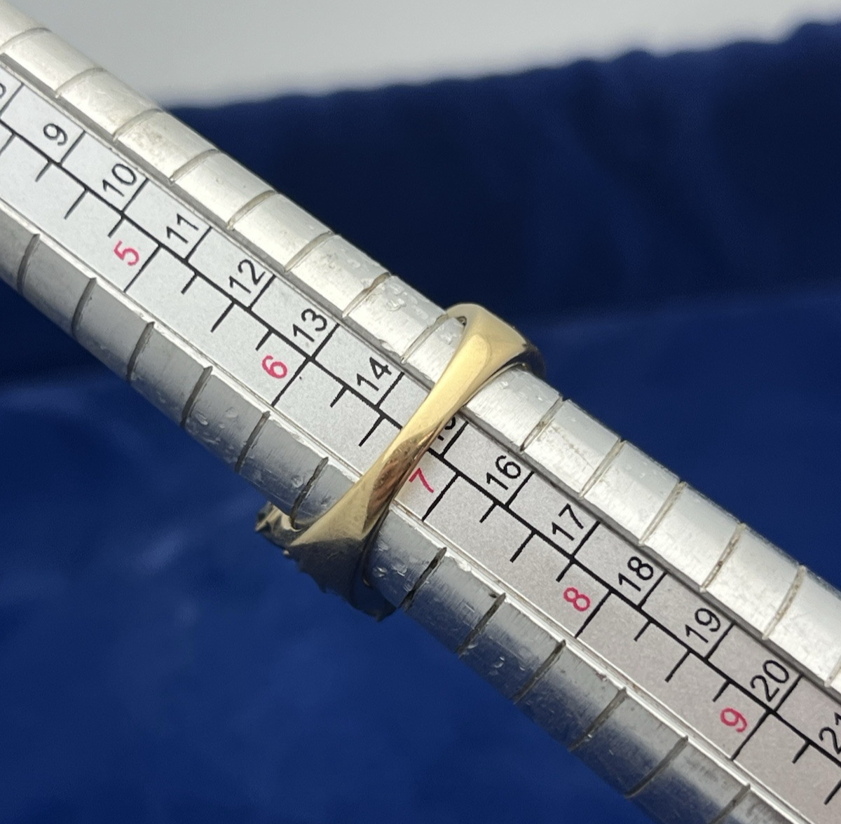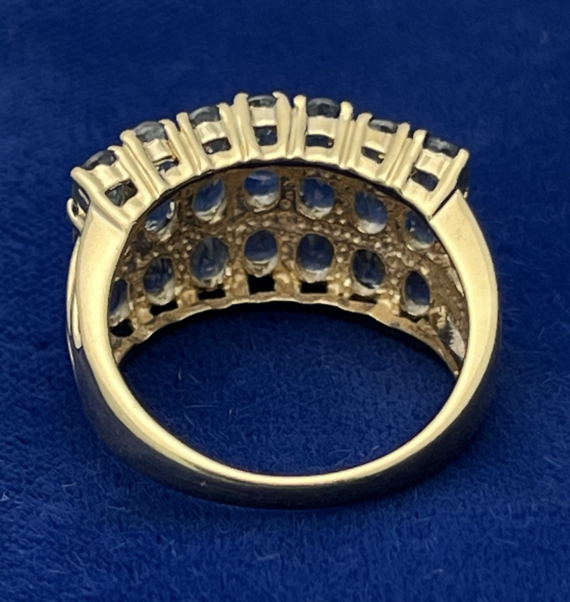 This is a 14k yellow gold ring from Thailand, featuring 21 faceted oval blue topaz stones. The ring is a size 6.75 and weighs 5.8 grams, marked 14K and CID. The dazzling sapphires are set in 7 rows of 3. The ring is in excellent condition, ready to add beauty to your collection.