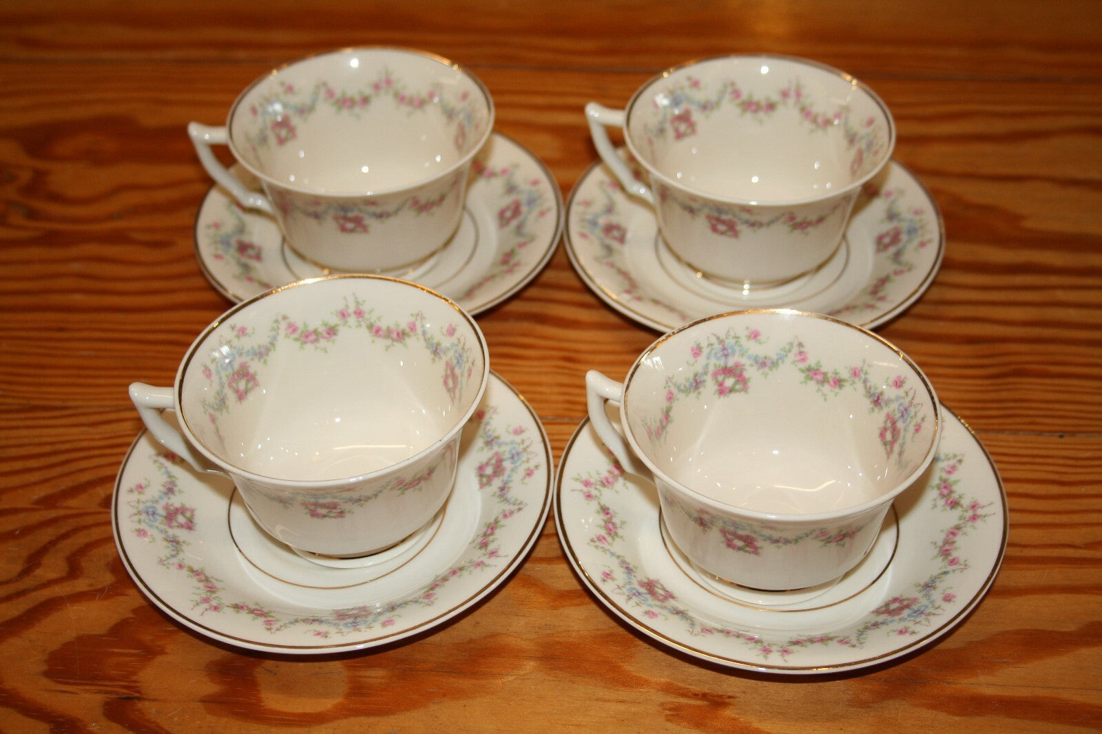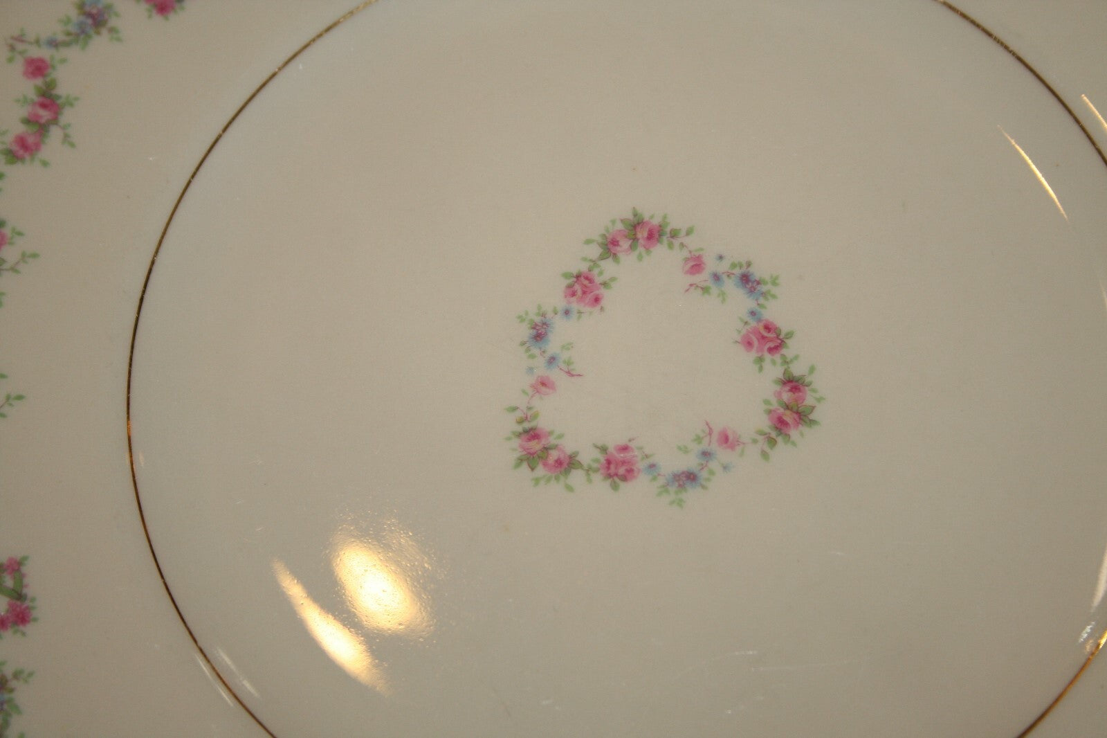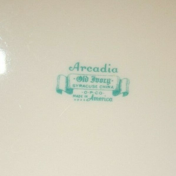 This elegant pattern was produced by Syracuse from 1949 through 1970 and is now discontinued. It features floral swags on the rim and a floral center, on an ivory body with gold lines.