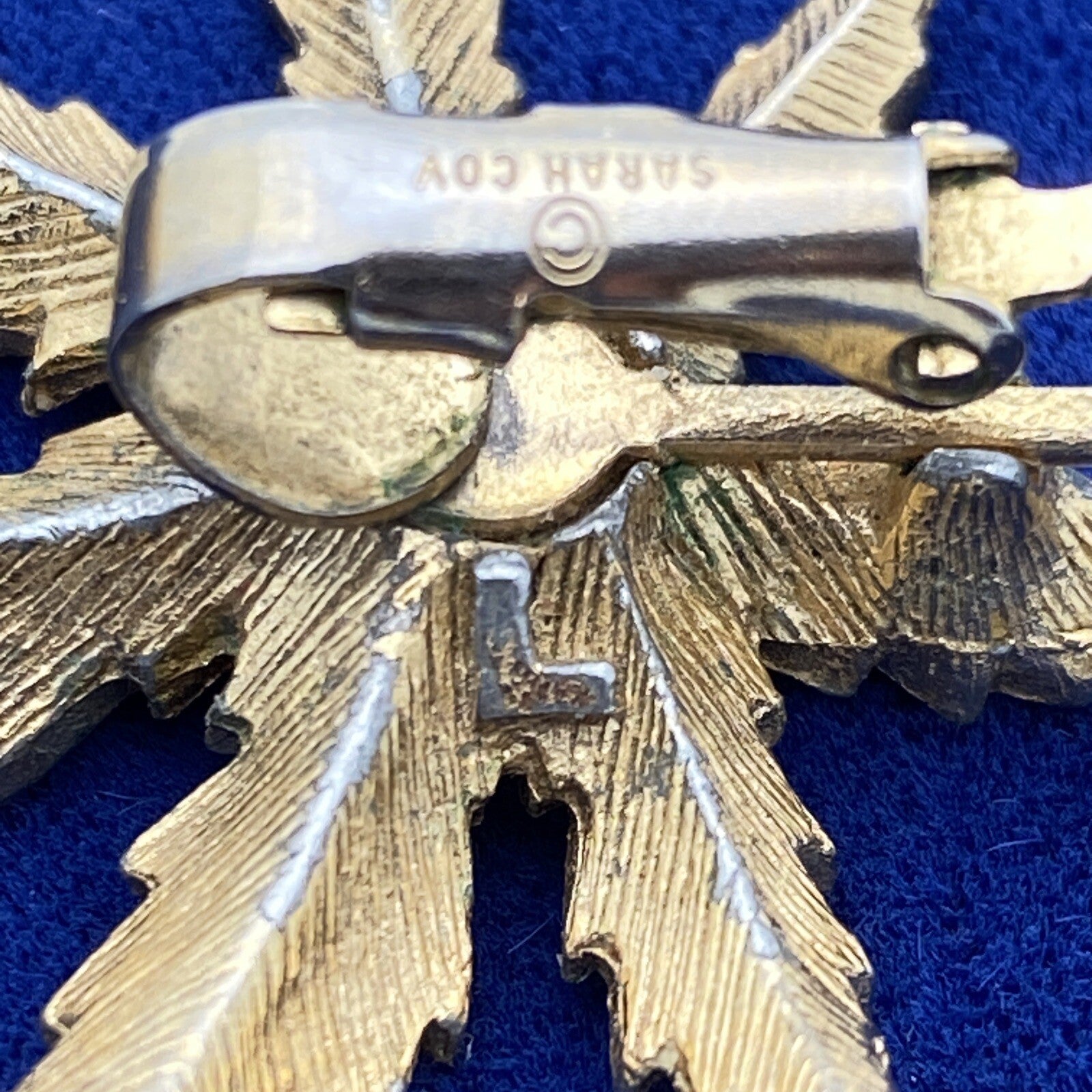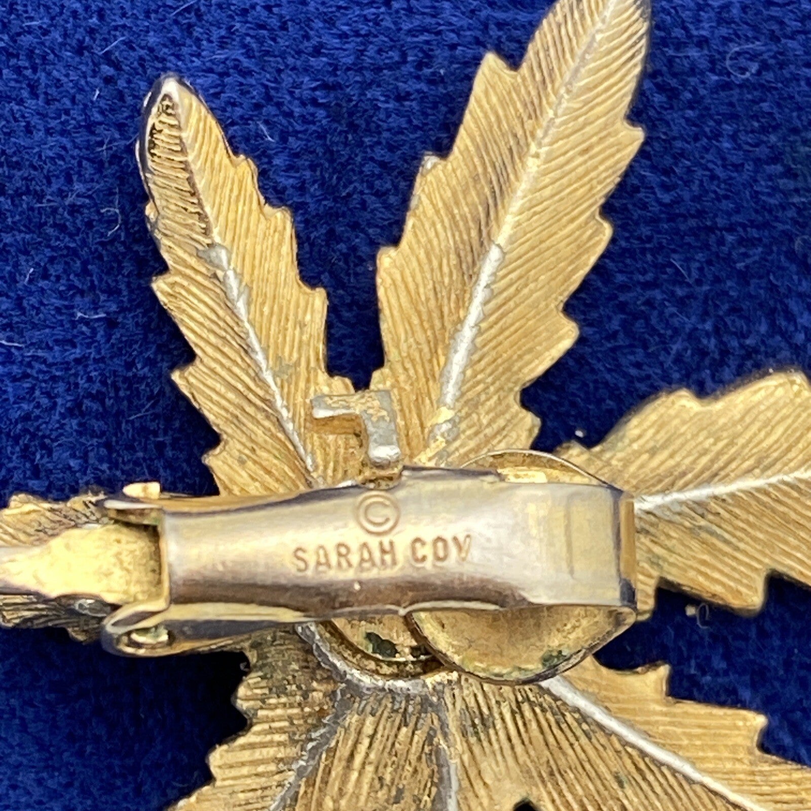 Pin also has a hook on the back so it can double as a pendant when a chain is attached (chain not included) All pieces are signed SARAH COV with copyright mark; earrings are mirror-images and marked L and R. Approximate measurements: Pin: 1. 375" x 2" ; Earrings: 1. 375" x 1. 5" Vintage and pre-owned set, with light wear indicative of age