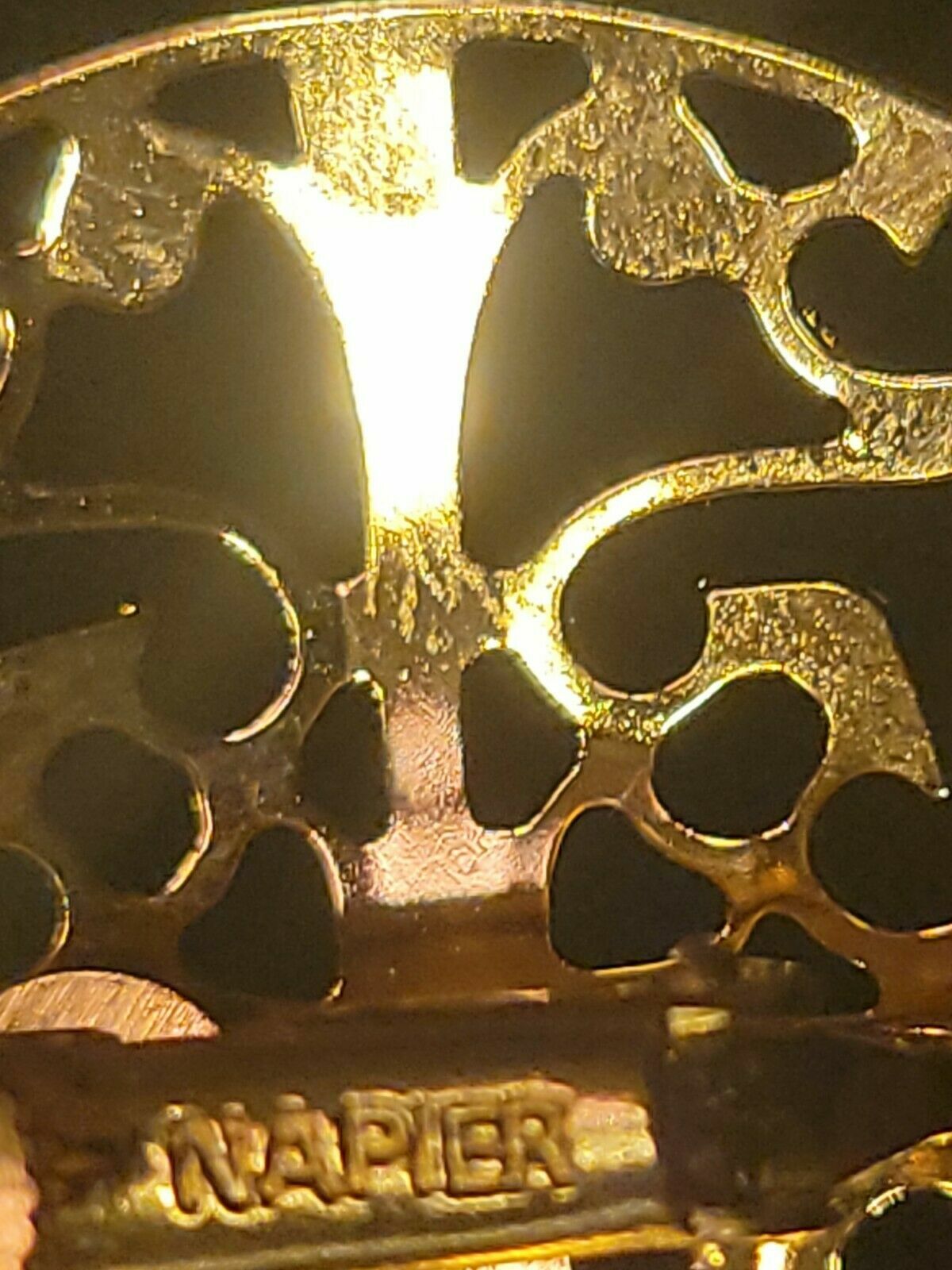 Offered for sale is pair of 1980s Napier gold filigree round clip screwback earrings., about 1.5^ diameter never worn. Shipped free with USPS first class.