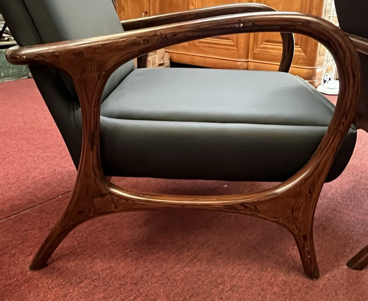 (lot of 2) Mid-century style faux leather and rosewood lounge chairs, in the manner of Vladimir Kagan (American, 1927-2016), 21st c., approx 42"h, 30"w, 30"d, seat height: approx 17"h