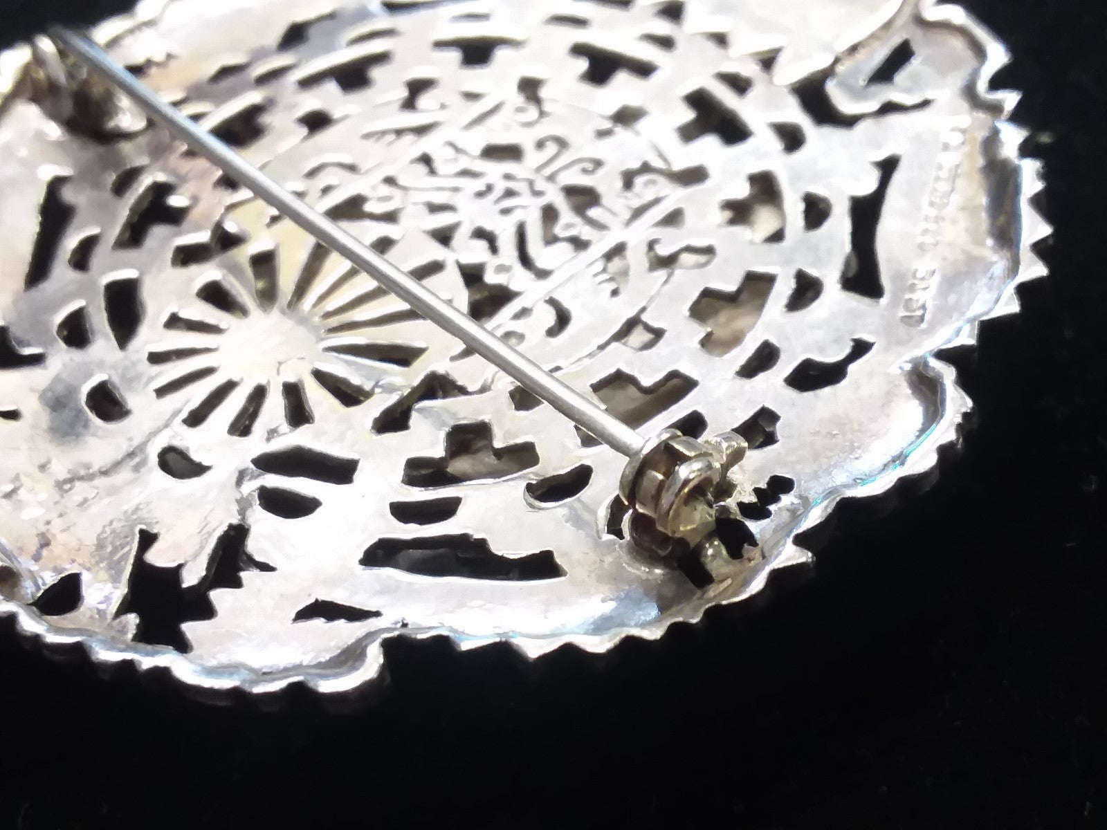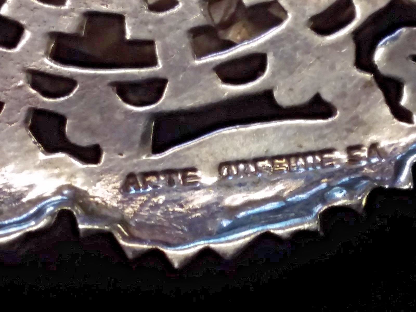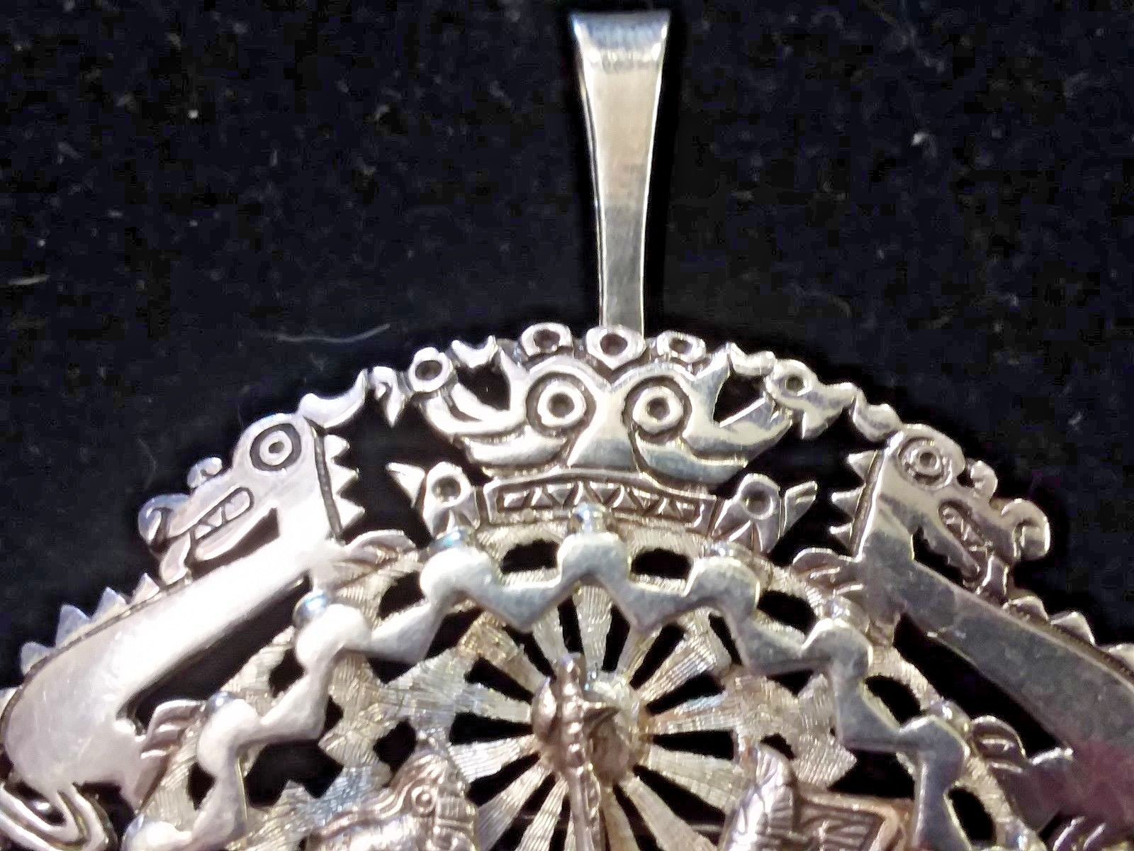 Offered for sale is a Vintage Arte Orfebre Peru Sterling Silver Large Round Ornate Carved Brooch Pin Pendant measuring 2 1/4" diameter plus a 1/2" bail. The incredible workmanship makes this a 3D diarama of a chaski in front of the Inca sovereign. Chaskis (Chasquis) were the famous Inca messengers , highly athletic runners who were capable of running great distances along the Inca's extensive network of roads called the Qhapaq Ñam - the royal roads. This work was the creation of a talented Peruvian silversmith. It weighs 25 grams. It is signed and marked 925. It can be worn as a brooch or a pendant. It is in very good condition with only minor scratches consistent with light wear and would make a wonderful addition to your collection!