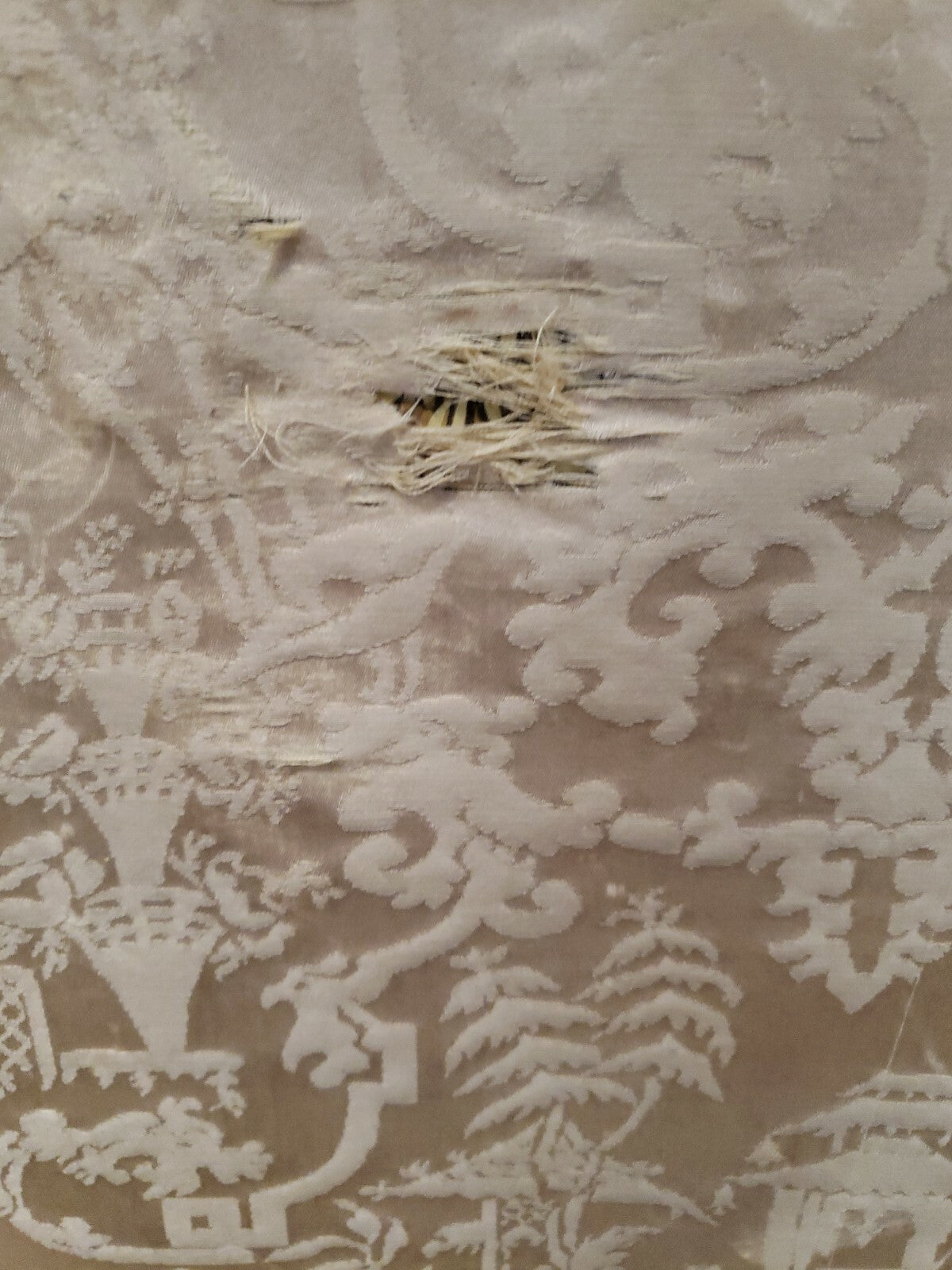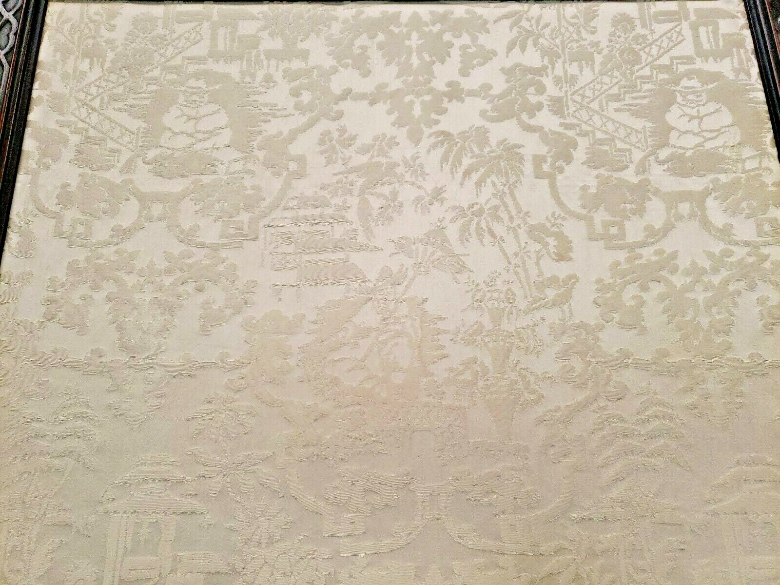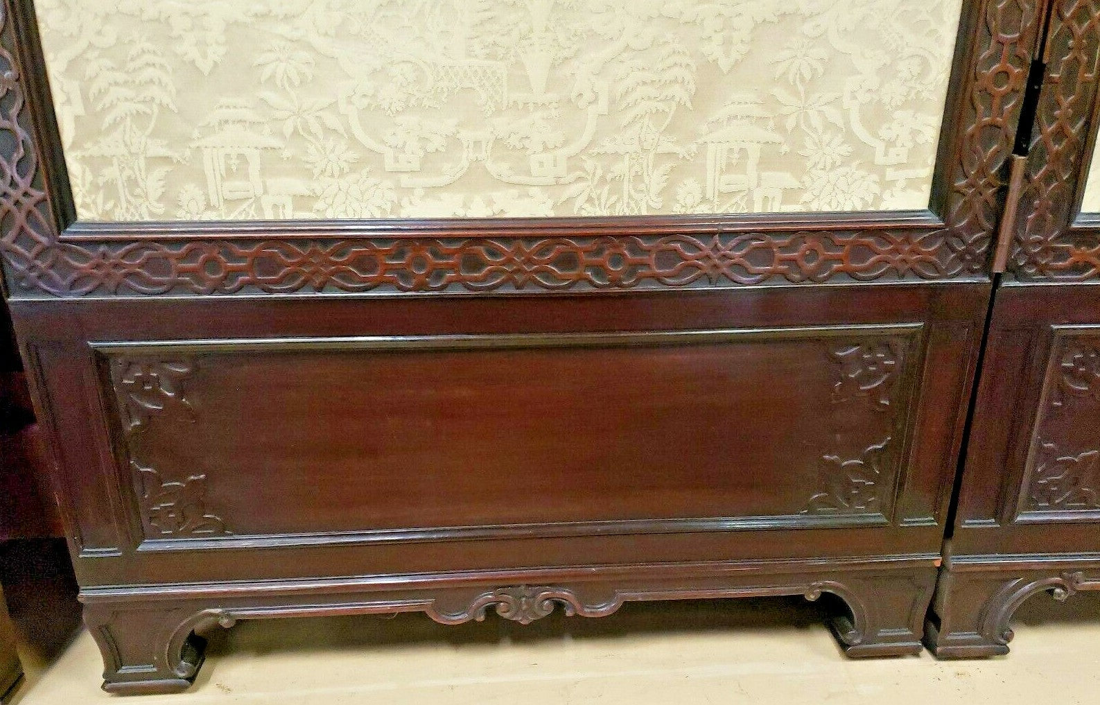 Offered for sale is an antique Chinese 3-panel floor screen with mahogany frames hand carved with crests of pagodas flanked by dragons. The total screen width is 6 ft with the middle panel measuring H 88" , outside panels H 86". Study the pics to appreciate the fine quality carvings on the frame. Each frame has double sided fabric inset panels decorated with traditional textile motifs. See the last pic for the small tear in one panel. This elegant screen is high quality and will add elegance to any setting-as a floor screen, art on the wall, or a headboard!