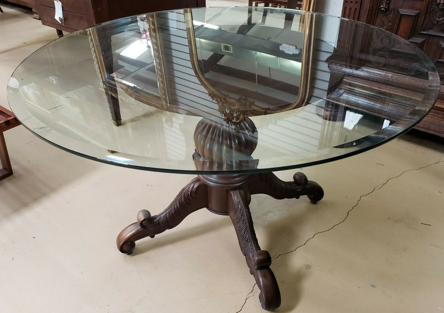 4 ft round Glass Top Table w Carved Mahogany Pedestal Base Great Foyer Breakfast