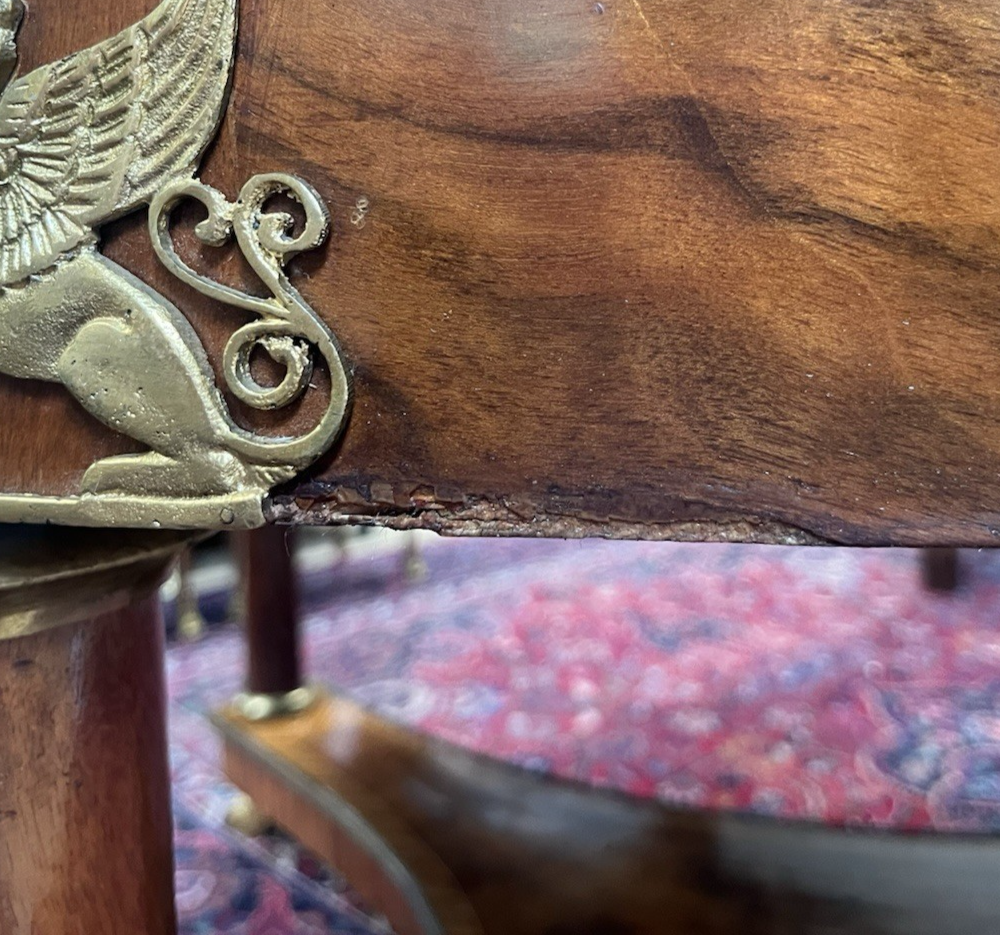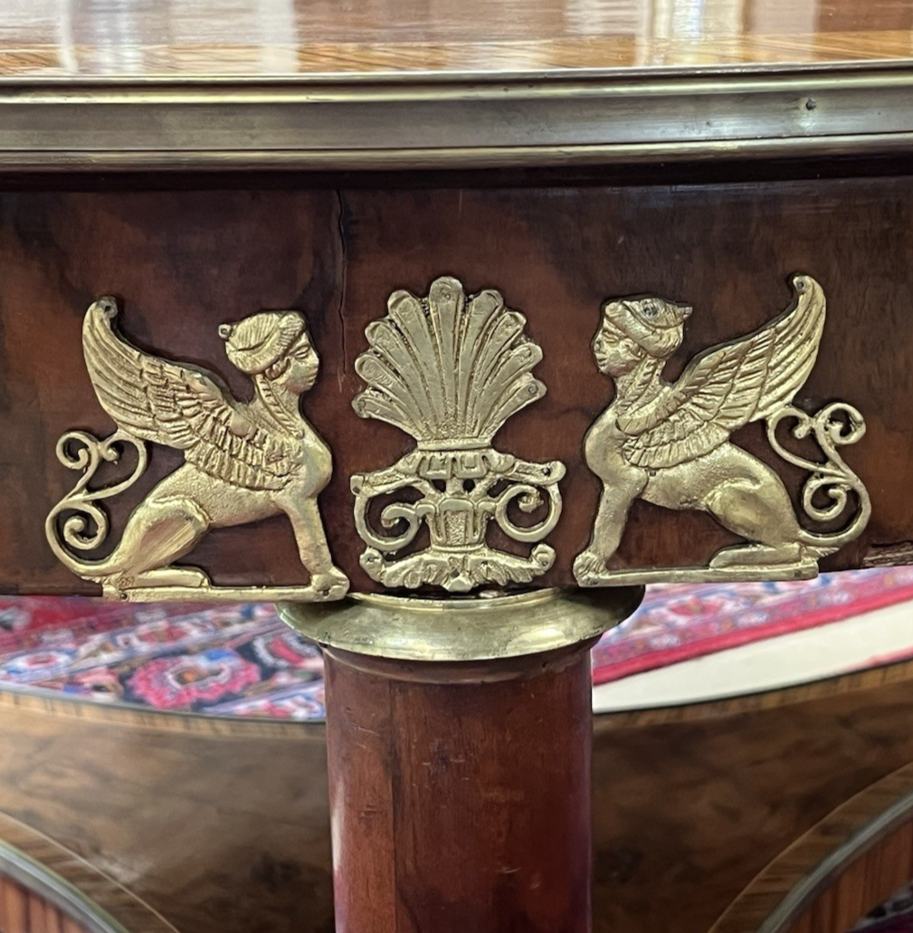 Large Empire style figured walnut center table, Stylisia Furniture, 20th c., having round top with contrasting string inlay and matched veneer trim, the apron mounted with Egyptianesque sphinx motifs, raised on smooth columnar supports, terminating on tripartite platform base, further rising on brass paw feet, tabletop with small centralized region of finish loss/ wear, approx 32.5"h, 66"diam