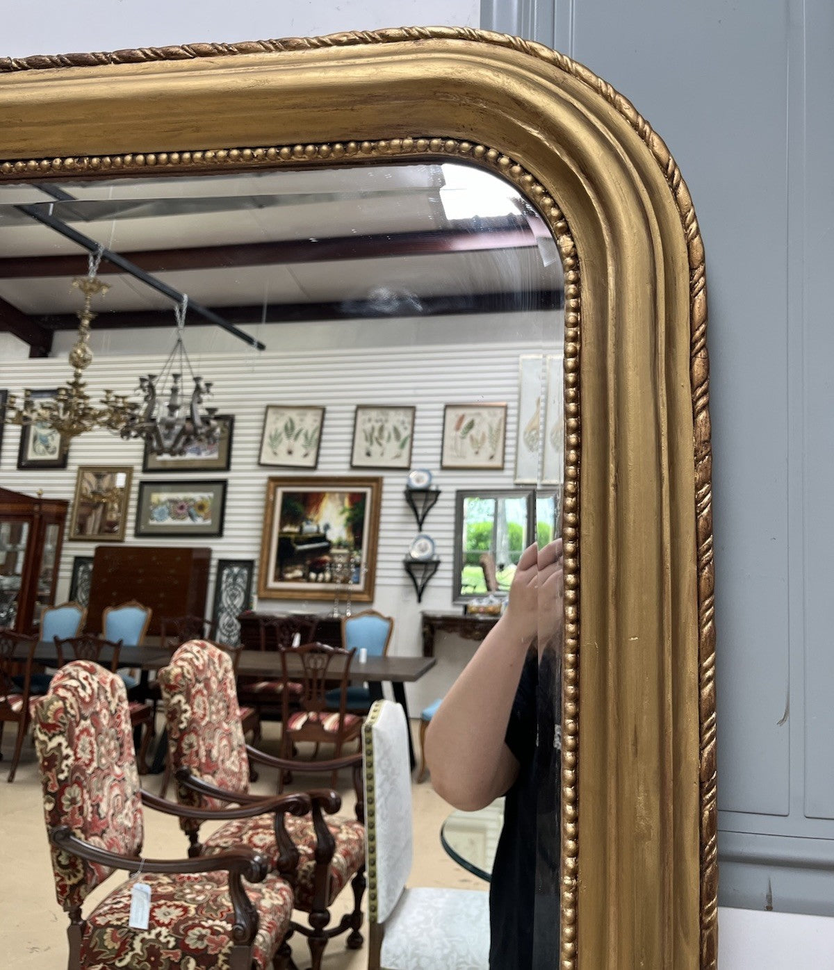 This is a tall French Louis Philippe style framed mirror with a gold finish. It has a rectangular shape with beveled edges