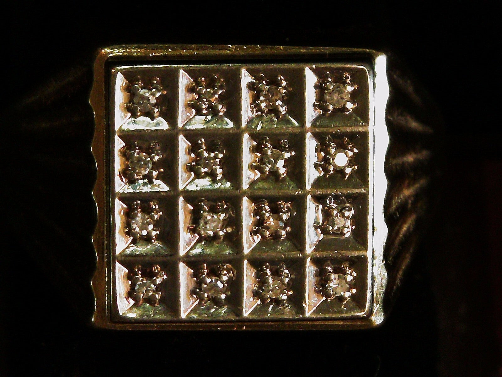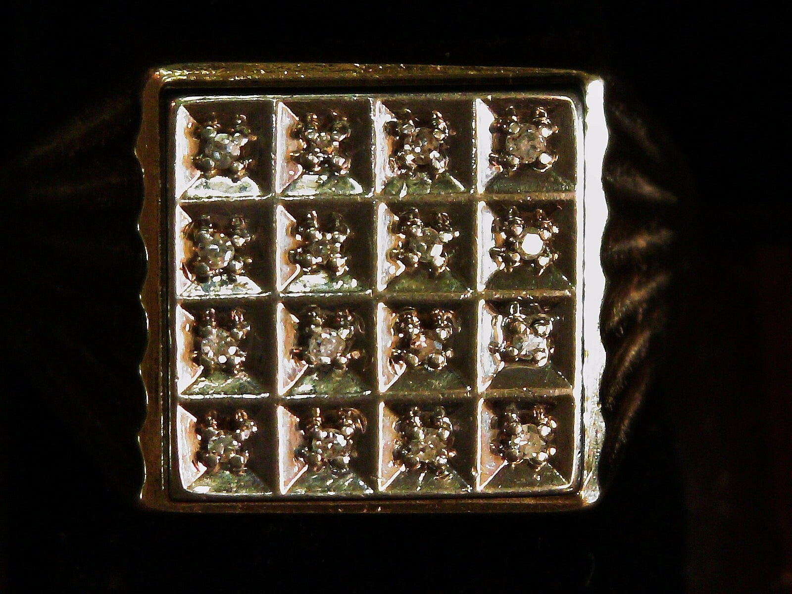 This stunning men's ring is crafted from 10k yellow and white gold, with a total weight of 8g. It features 16 dazzling diamonds that sparkle in the light. The ring is a size 12.25 and is perfect for any occasion. The gold color of the ring is elegant and timeless making it a great addition to any jewelry collection. The diamonds are .16cts in total weight and are all white/colorless.
