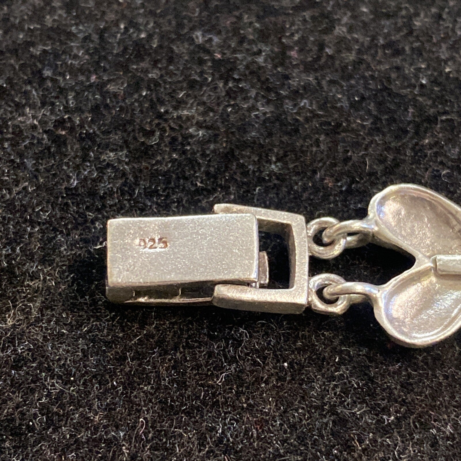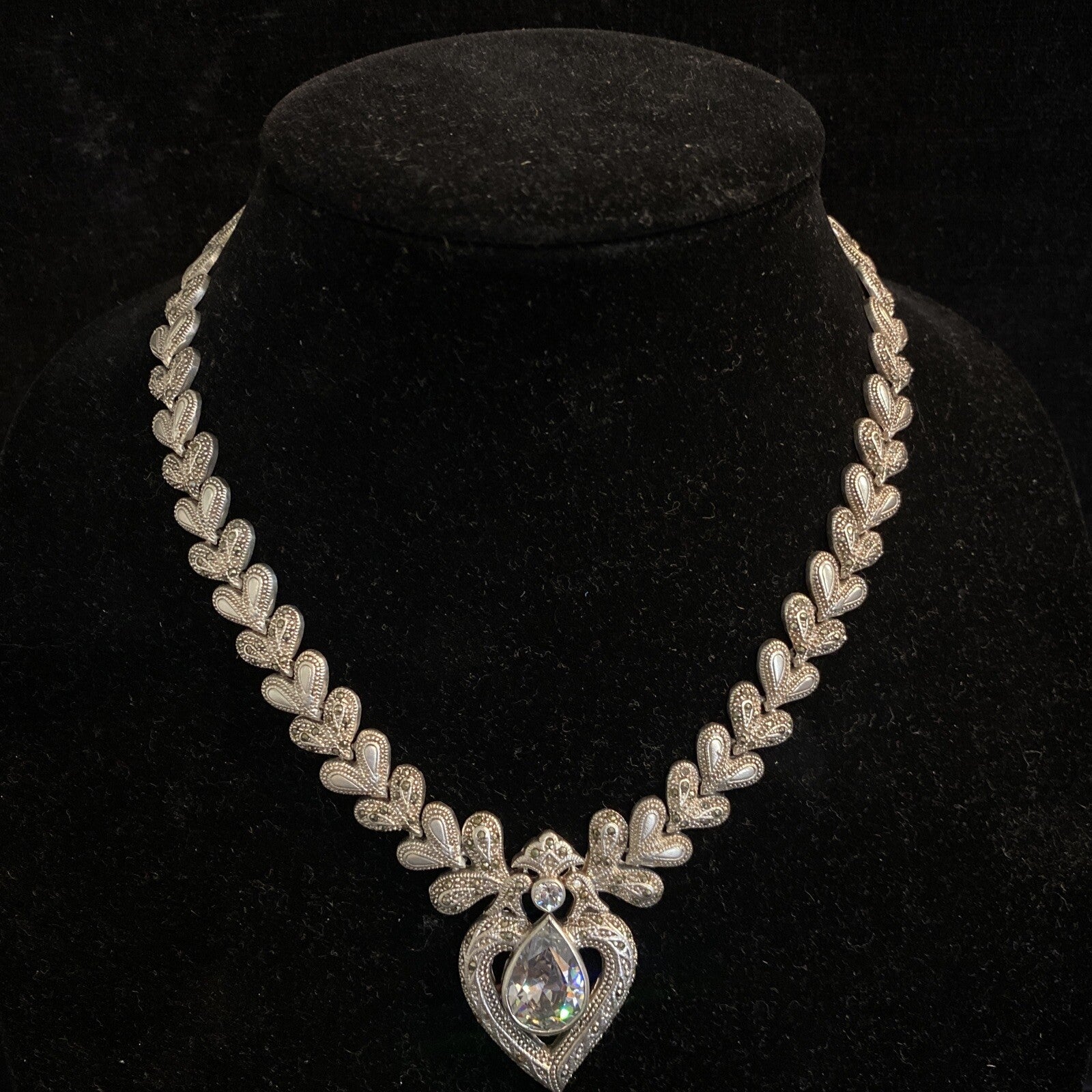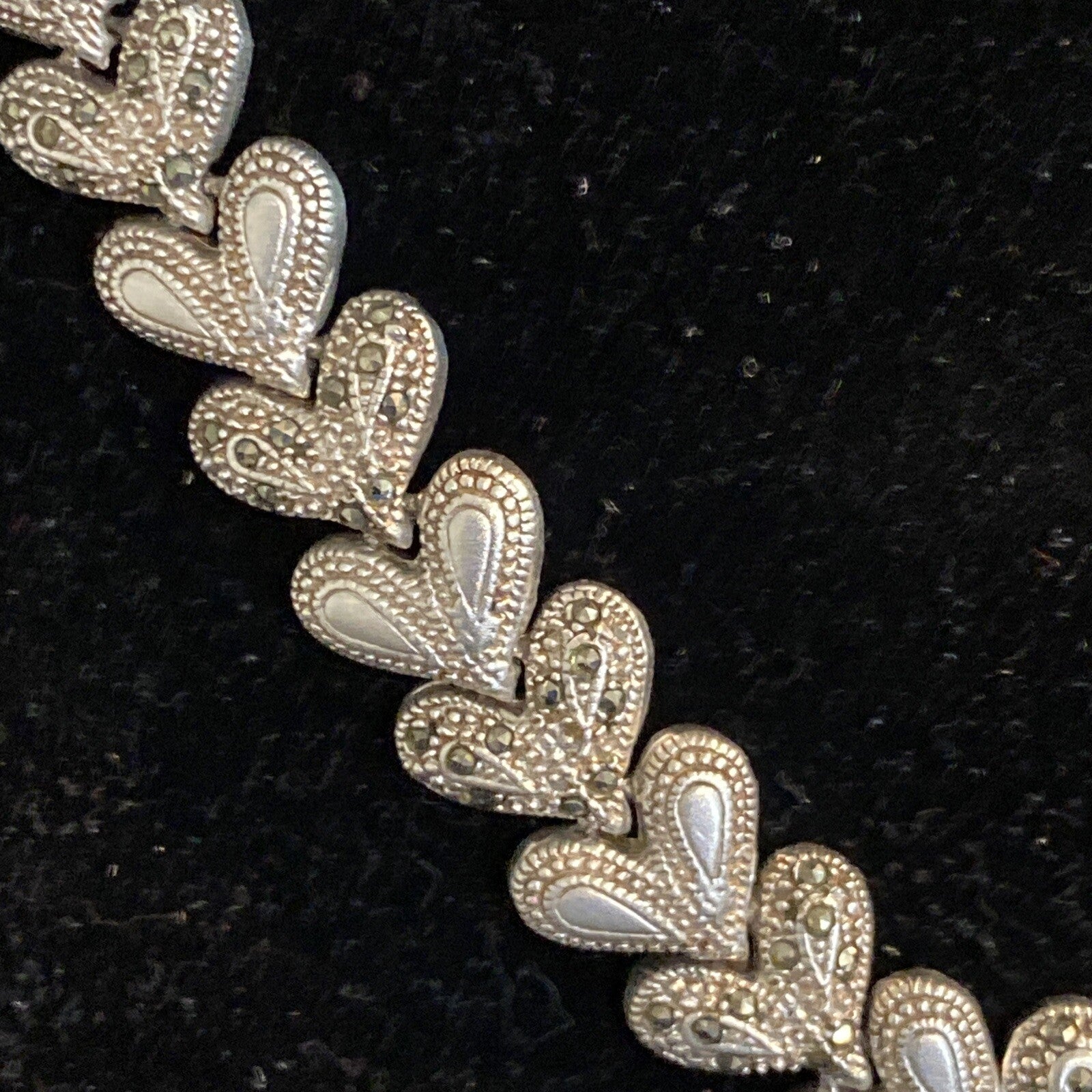 Offered for sale is a sterling silver heart design link necklace. The necklace contains marcasite gemstones and is 17.5 inches in legnth. It has a total weight of 77.1 grams and is marked 925. Lots of artistry and workmanship in this beautiful necklace!