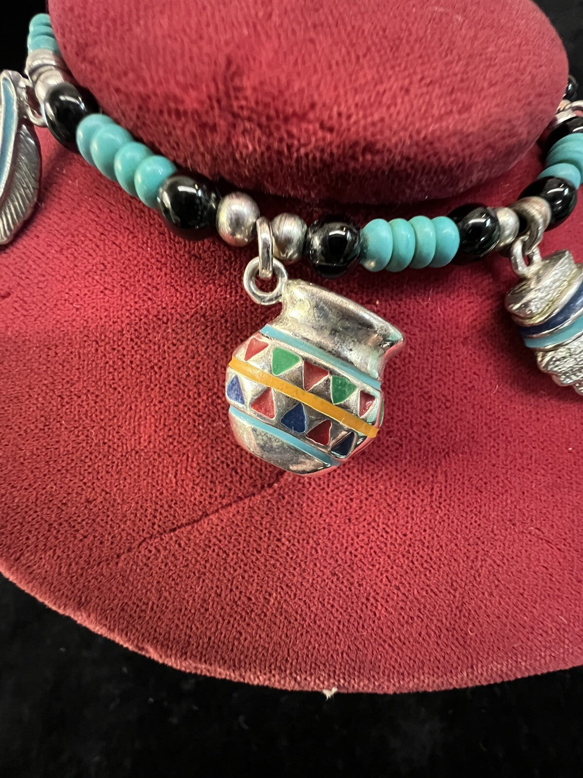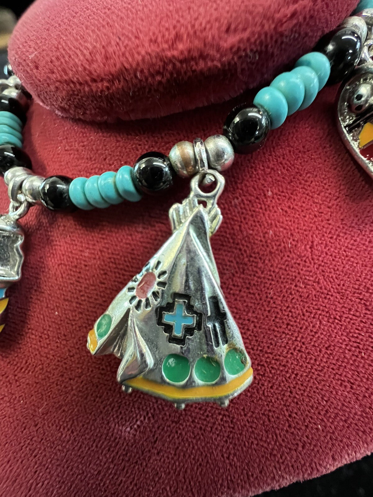 Charms on the bracelet: Tee-pee, Moccasins, Dream Catcher, Arrow Head, Jug, Feather, Whistle?