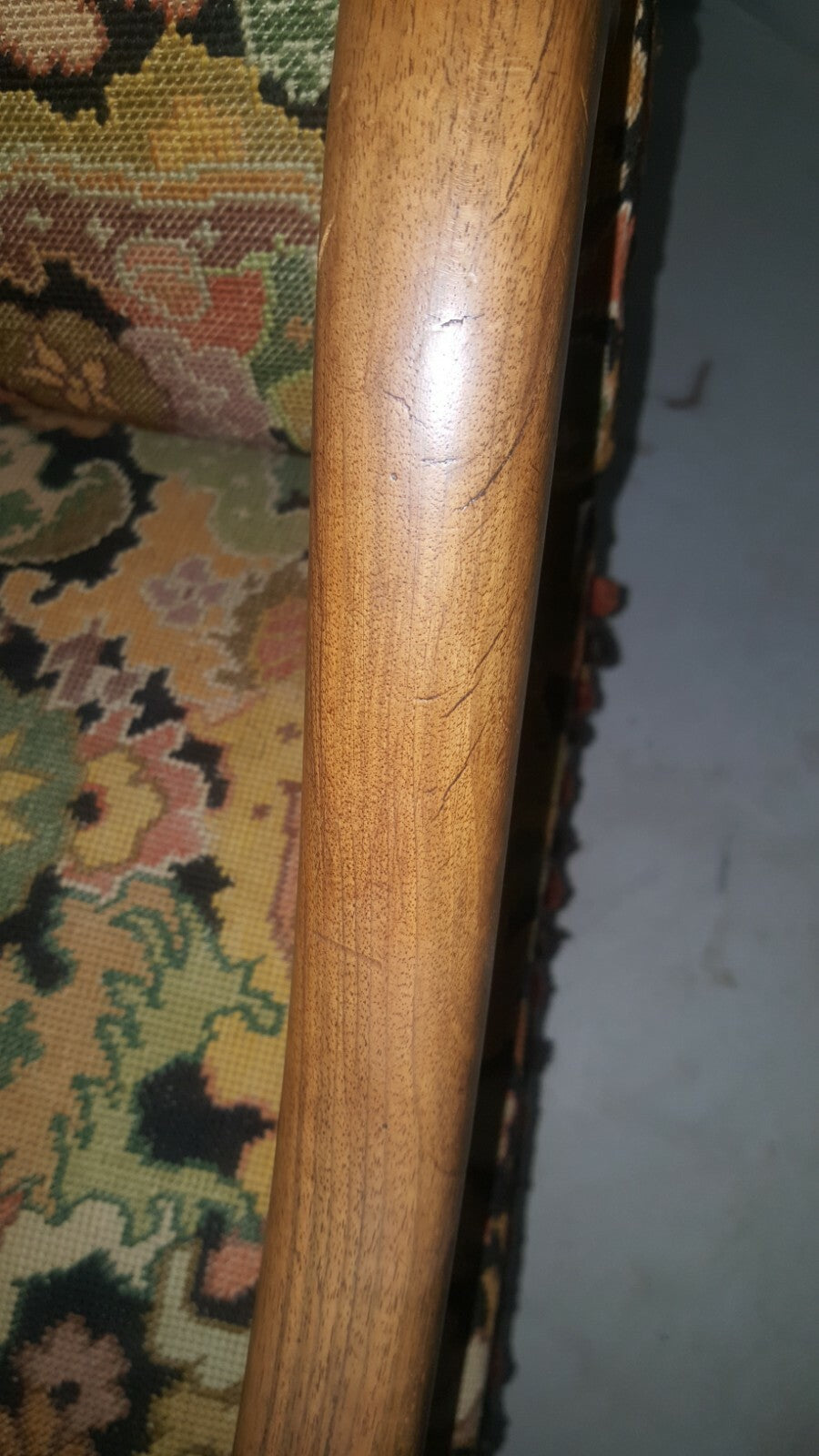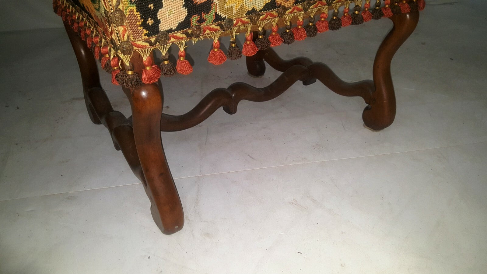 Offered for sale is an antique French armchair in needlepoint. The style is Os du Mouton. The needlepoint back and seat cover is all hand made and exquisite colors-pale gold, salmon, green. The chair back features a medieval couple in a cartouche. The chair is very sturdy and sits comfortably. It measure H 43" x W 18" x D 17". Seat height is 19". The back of the chair is covered in a thin cotton with a tear in the lower right corner. I would replace the back with a complimentary soft velvet-easily done with 1 yard fabric and brass tacks.