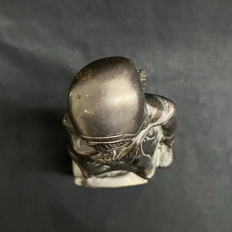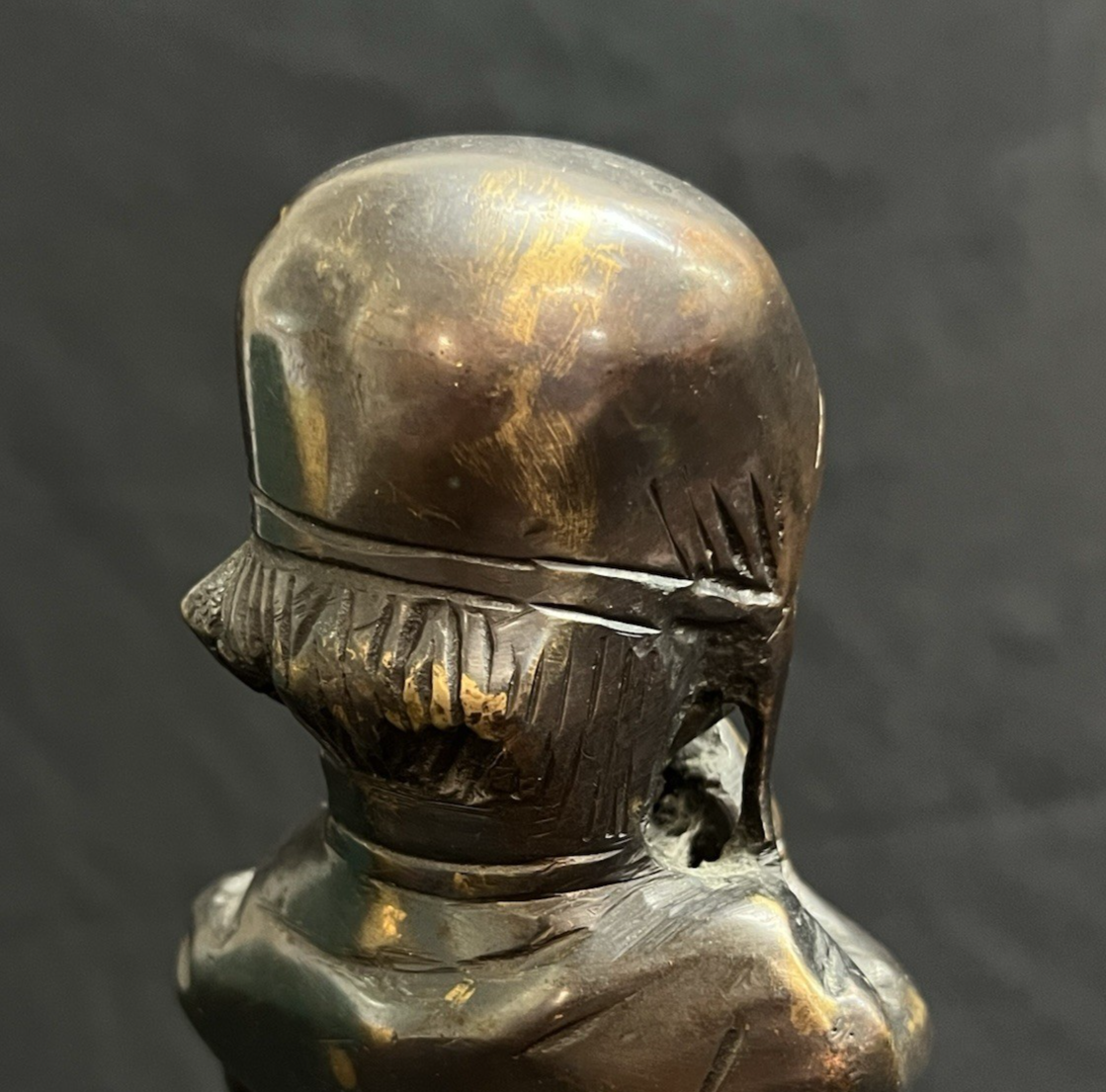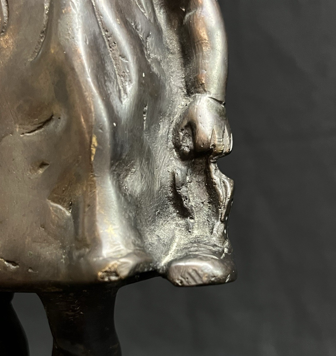The product is an antique bronze sculpture of a girl sitting on a chair with one shoe, created by artist Juan Clara. This small statue measures 11.5 inches in height, 3.5 inches in length, and 2.75 inches in width. The piece is intricately detailed and depicts a child theme, making it a unique and charming addition to any art collection. The bronze casting technique enhances the quality and craftsmanship of this sculptural work.