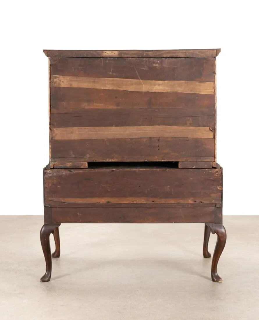 ANTIQUE ENLISH QUEEN ANNE SEAWEED MARQUETRY MAHOGANY CHEST ON STAND