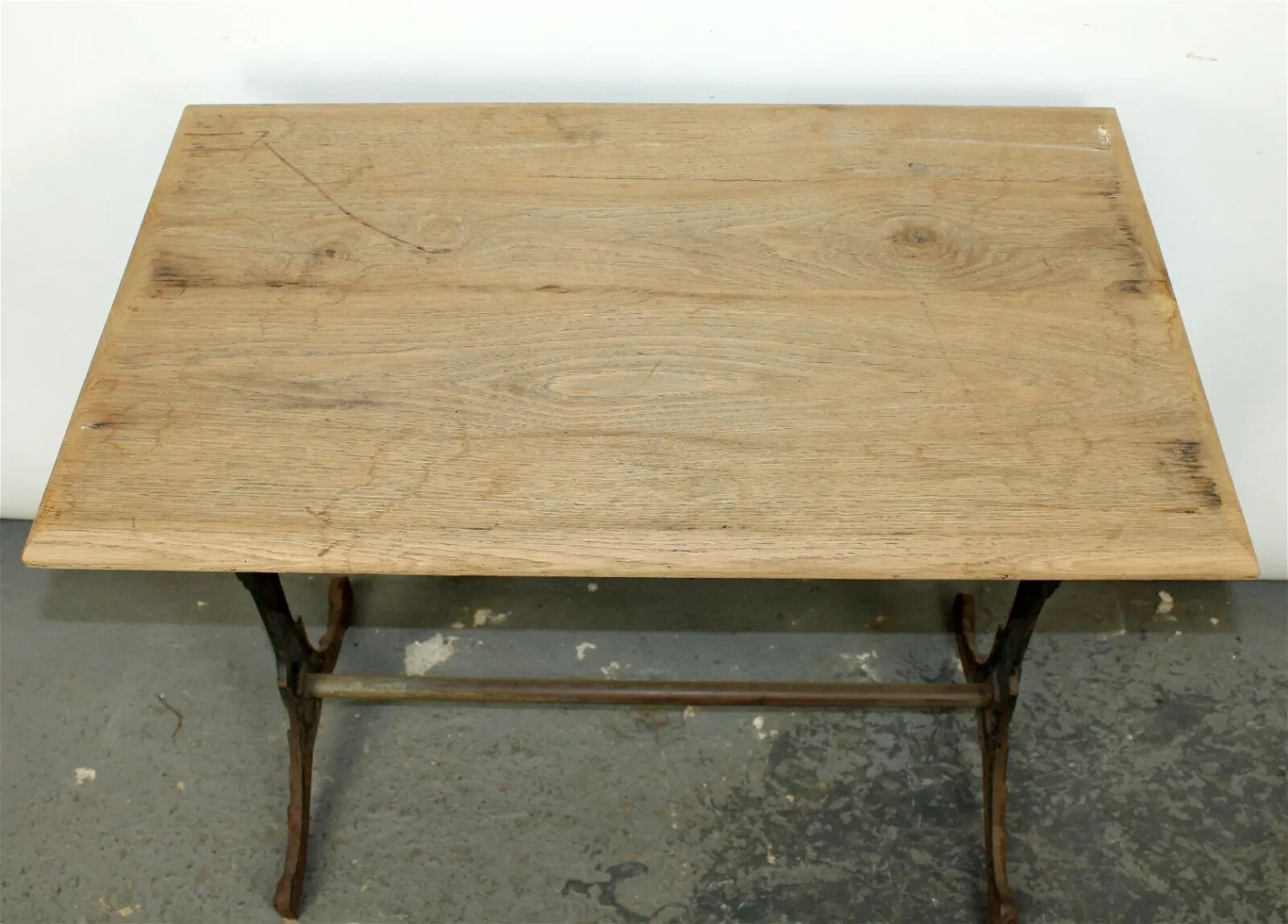 Antique French Art Deco bistro table w/ cast iron base natural white oak top