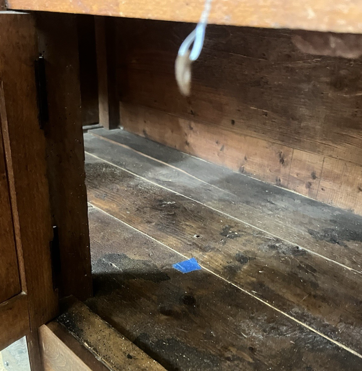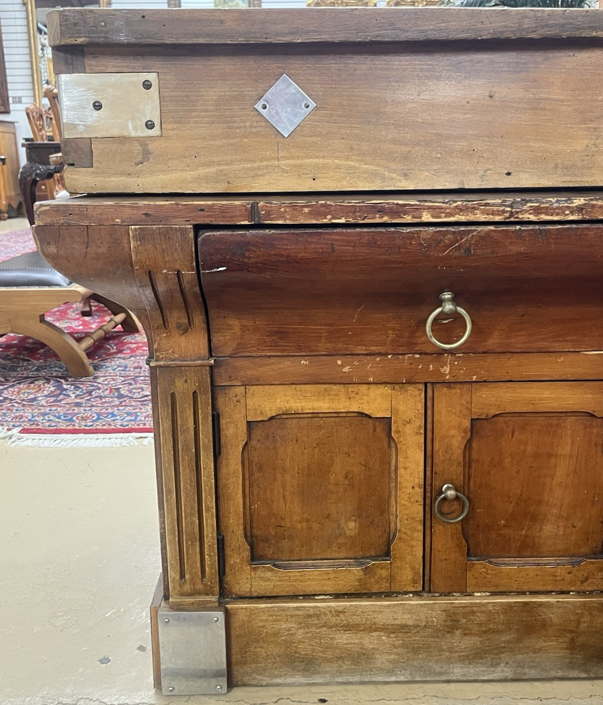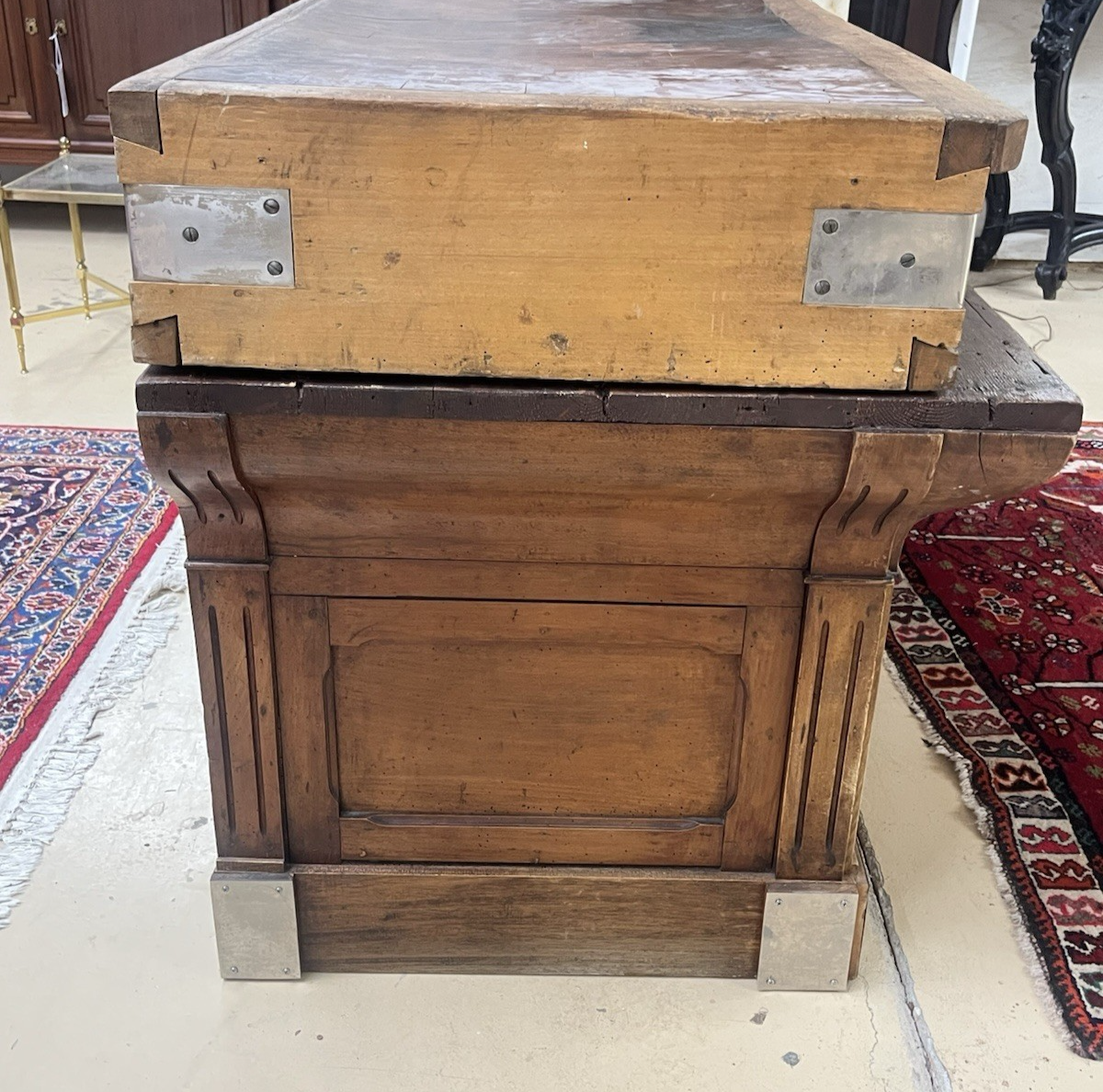 French mixed wood work table, early 20th c., added well-worn end-grain work surface, stainless steel corner brackets and diamond form accents, resting on a base with two deep drawers and four cabinet doors, flanked by fluted pilasters, approx 34"h, 61"w, 28"d