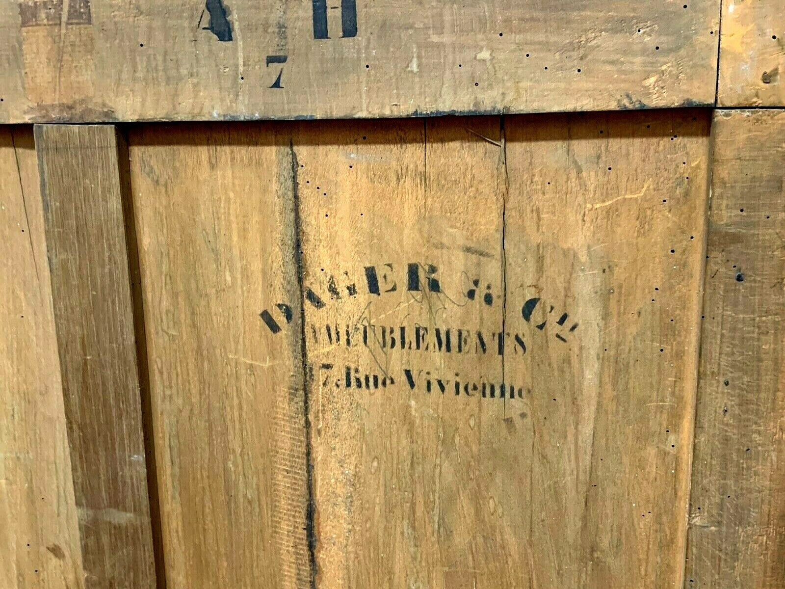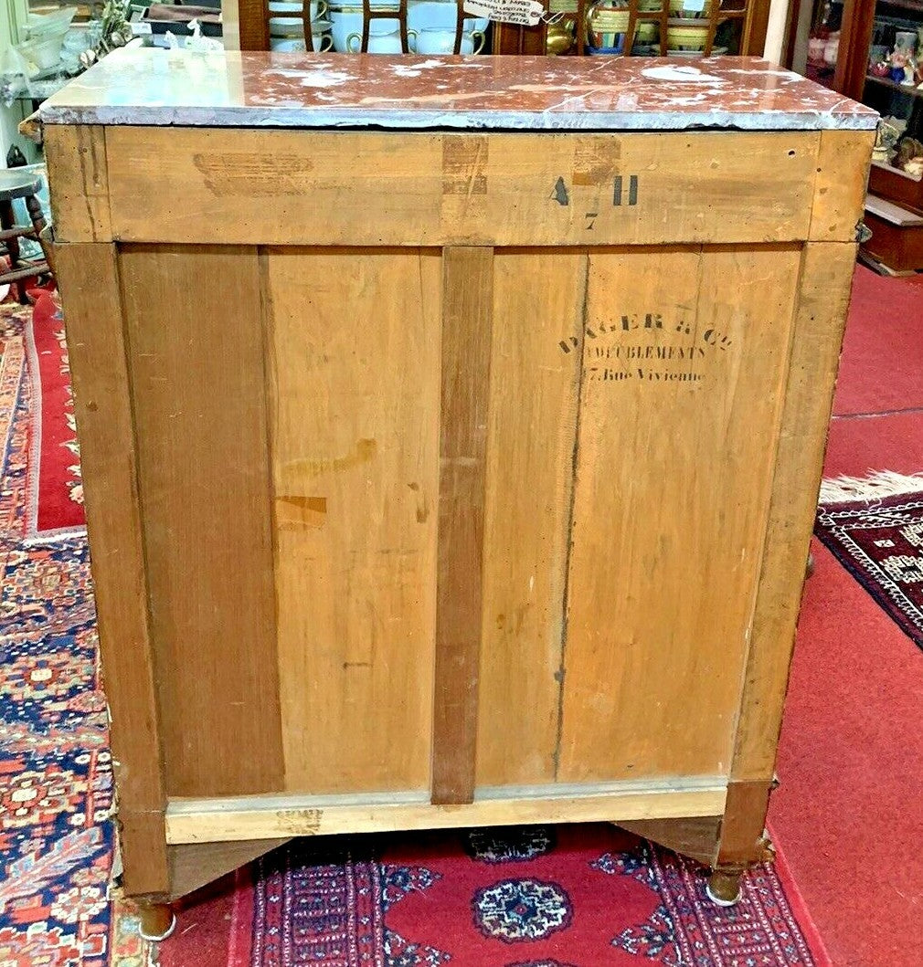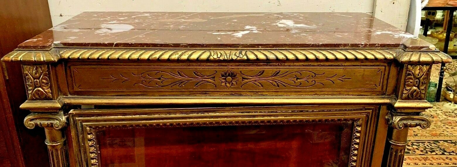Offered for sale is an antique French giltwood cabinet with a single glass door , glass sides and rouge marble top -all original. It started life in France in the late 1800's. See the pic of the back stamp -Dager & Cie Ameublements, 17 Rue Vivienne, Paris. It has 2 removable glass shelves. It is missing the lock. A beautiful authentic French antique.. measures 44.5" H, 35" W, 16" D