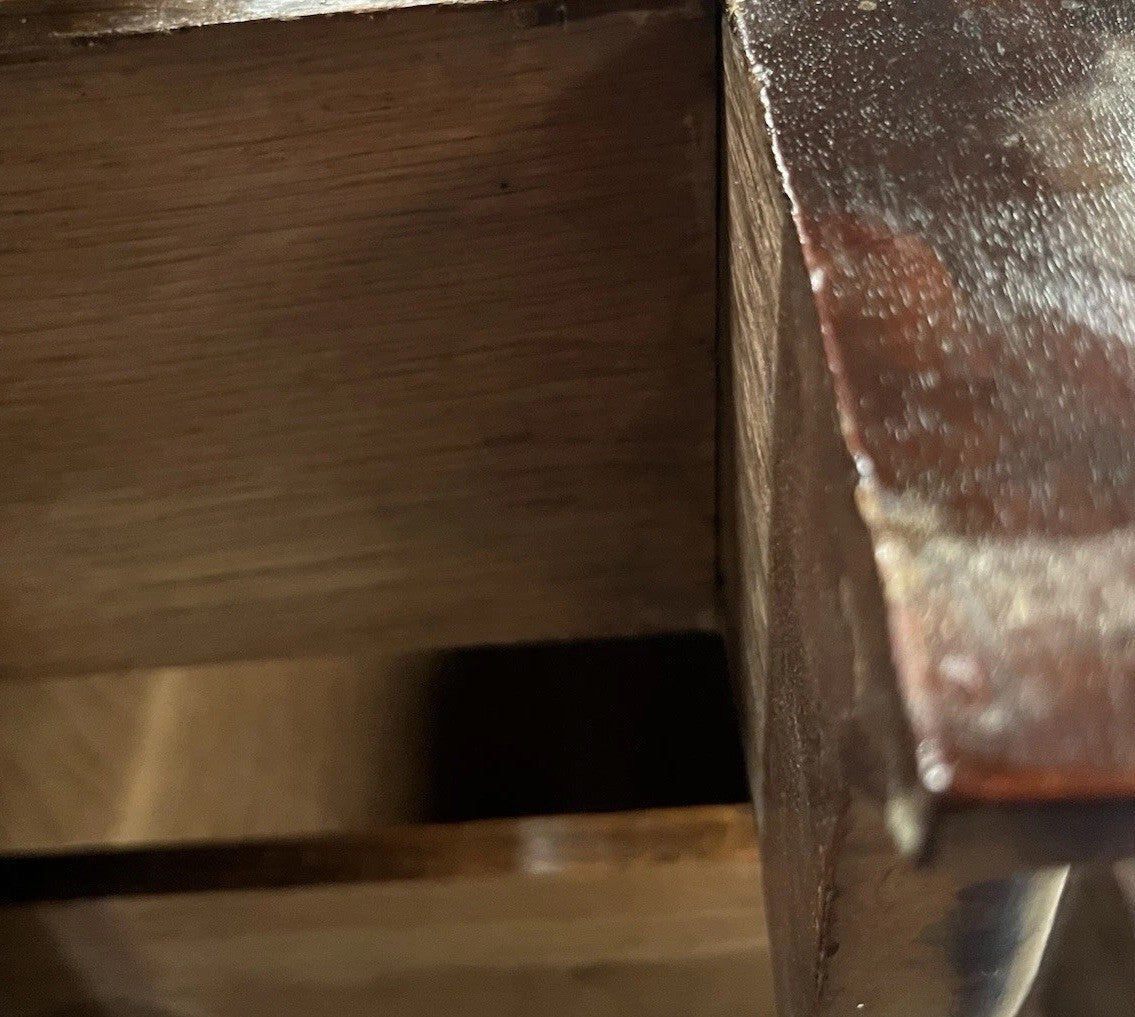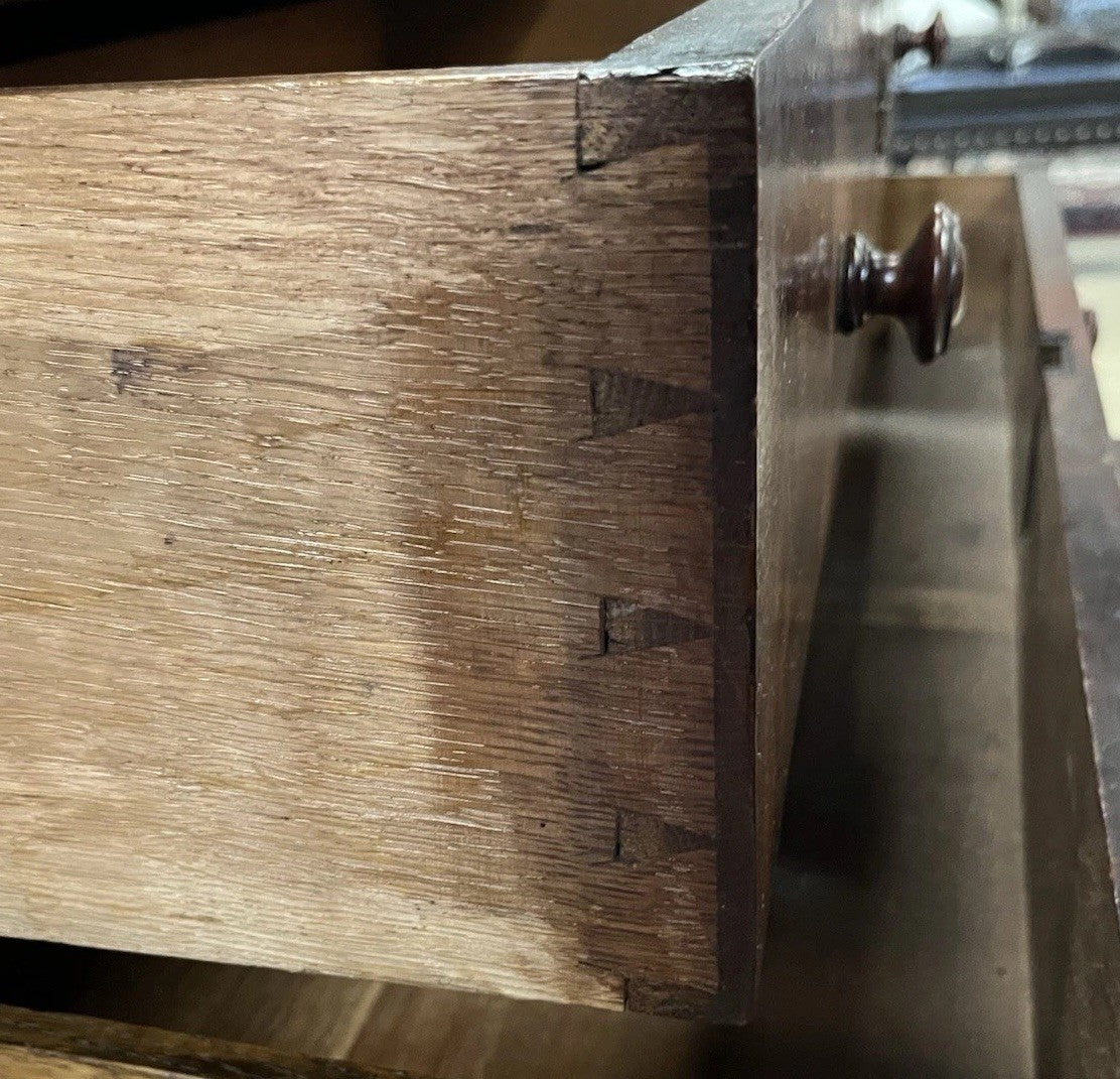 French Louis Philippe period figured mahogany commode, mid 19th c., having marble top, over five drawers, upper frieze drawer revealing sectioned interior, rising on bracket feet, splits with fill repair to both sides, approx 37.5"h, 51"w, 22.5"d