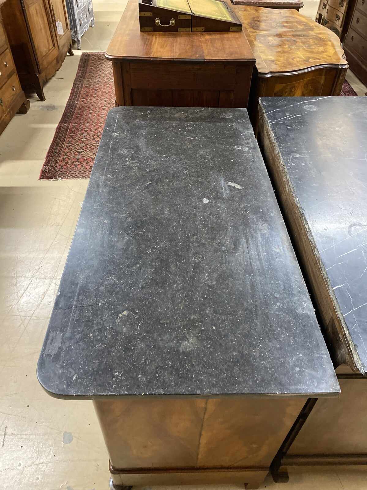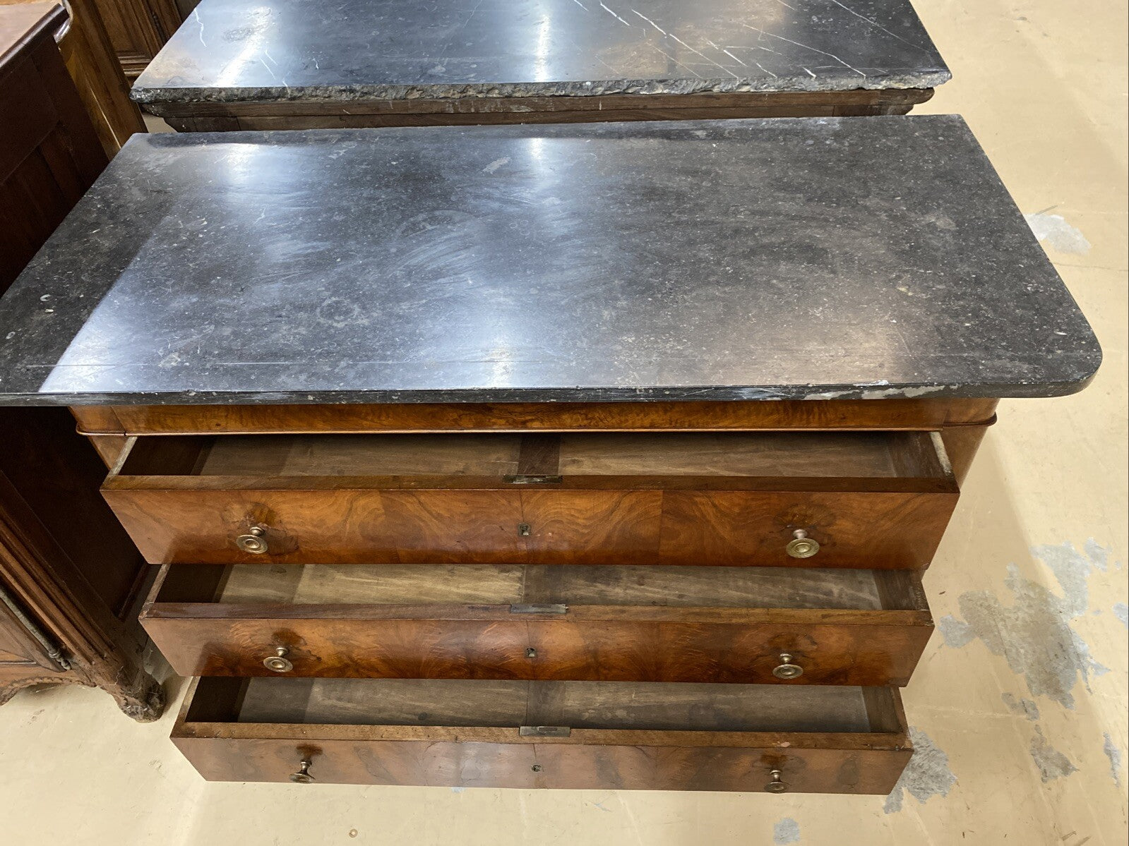 French Louis Philippe period figured mahogany commode. From the mid 19th c., having marble top, above four drawers, rising on shaped front feet.
