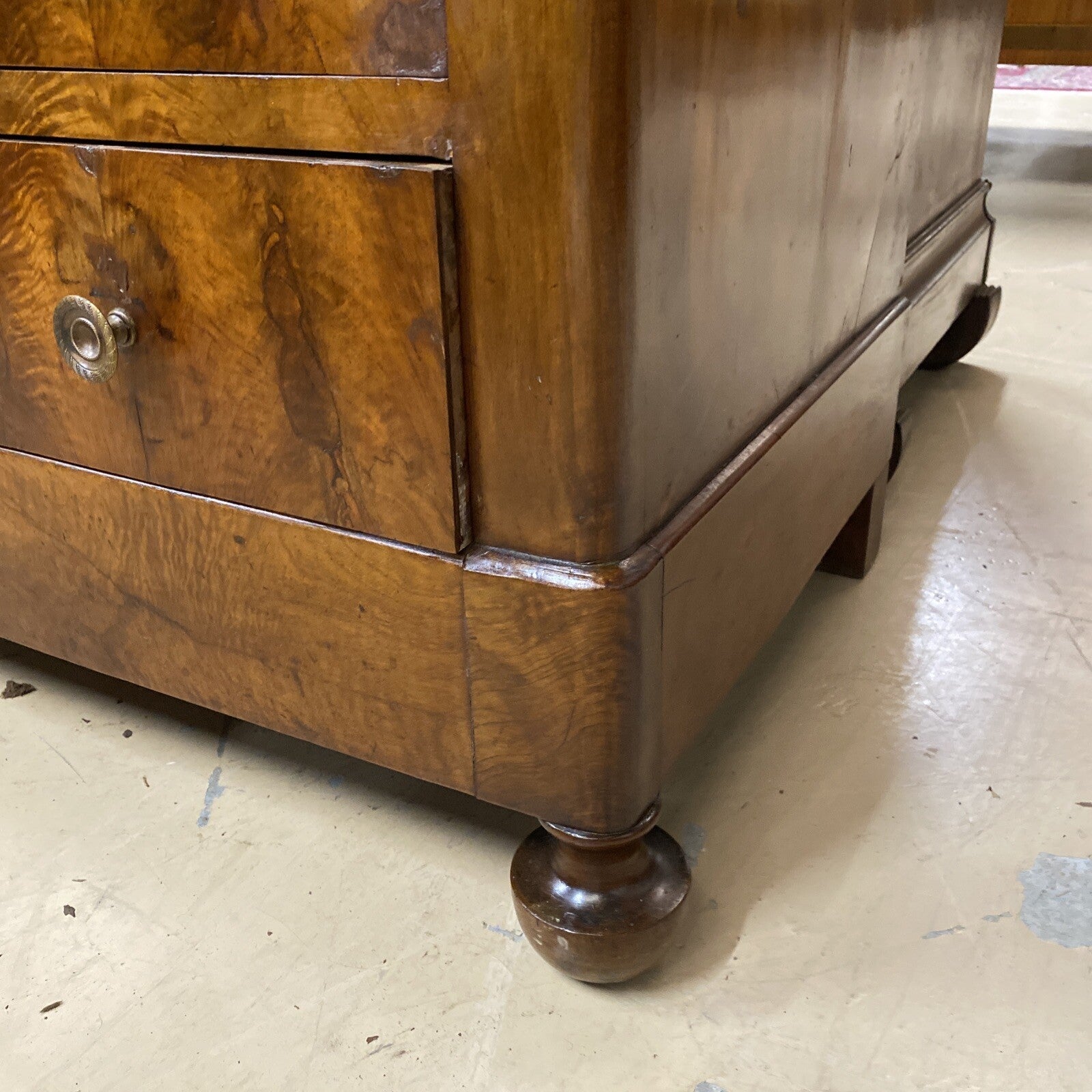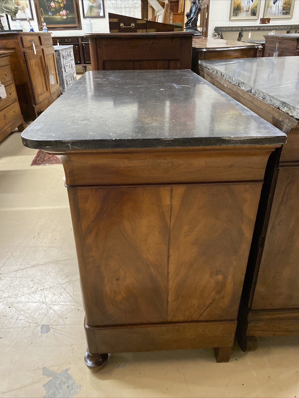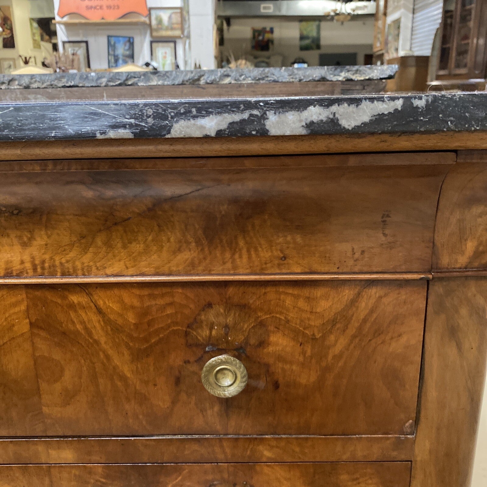 ANTIQUE FRENCH LOUIS PHILIPPE MARBLE-TOP FLAME BURLED MAHOGANY COMMODE CHEST