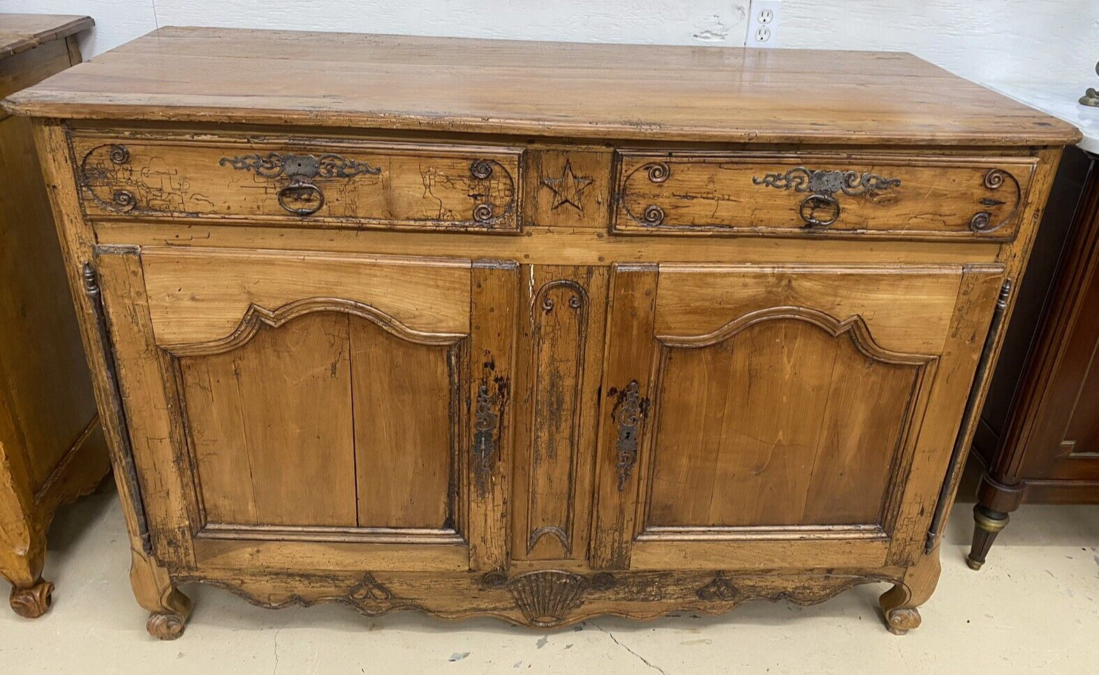 French Louis XV Style Cherrywood Sideboard, 19th c., the shaped molded top, over two frieze drawers above two spurred paneled doors, flanked by fluted stiles, on scrolled toes.