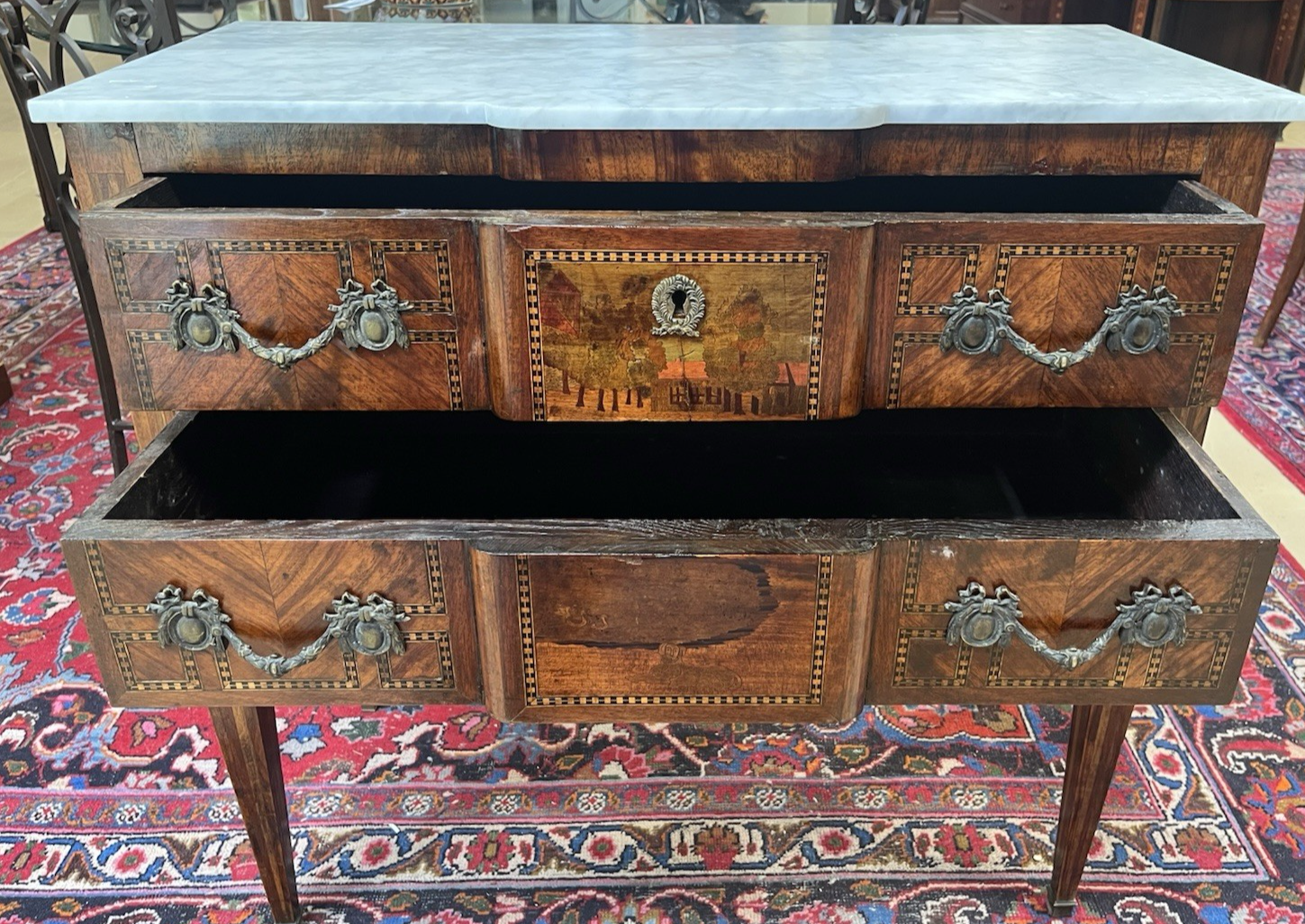 French Louis xvi matched-veneer breakfront commode, 19th c., having shaped marble top, over conforming case fitted with two drawers, central marquetry scene depicting tree-lined street and seated hound, with banded parquetry trim, rising on inlaid tapering legs, ending on brass cap feet, approx 34.5"h, 36"w, 17.75"d