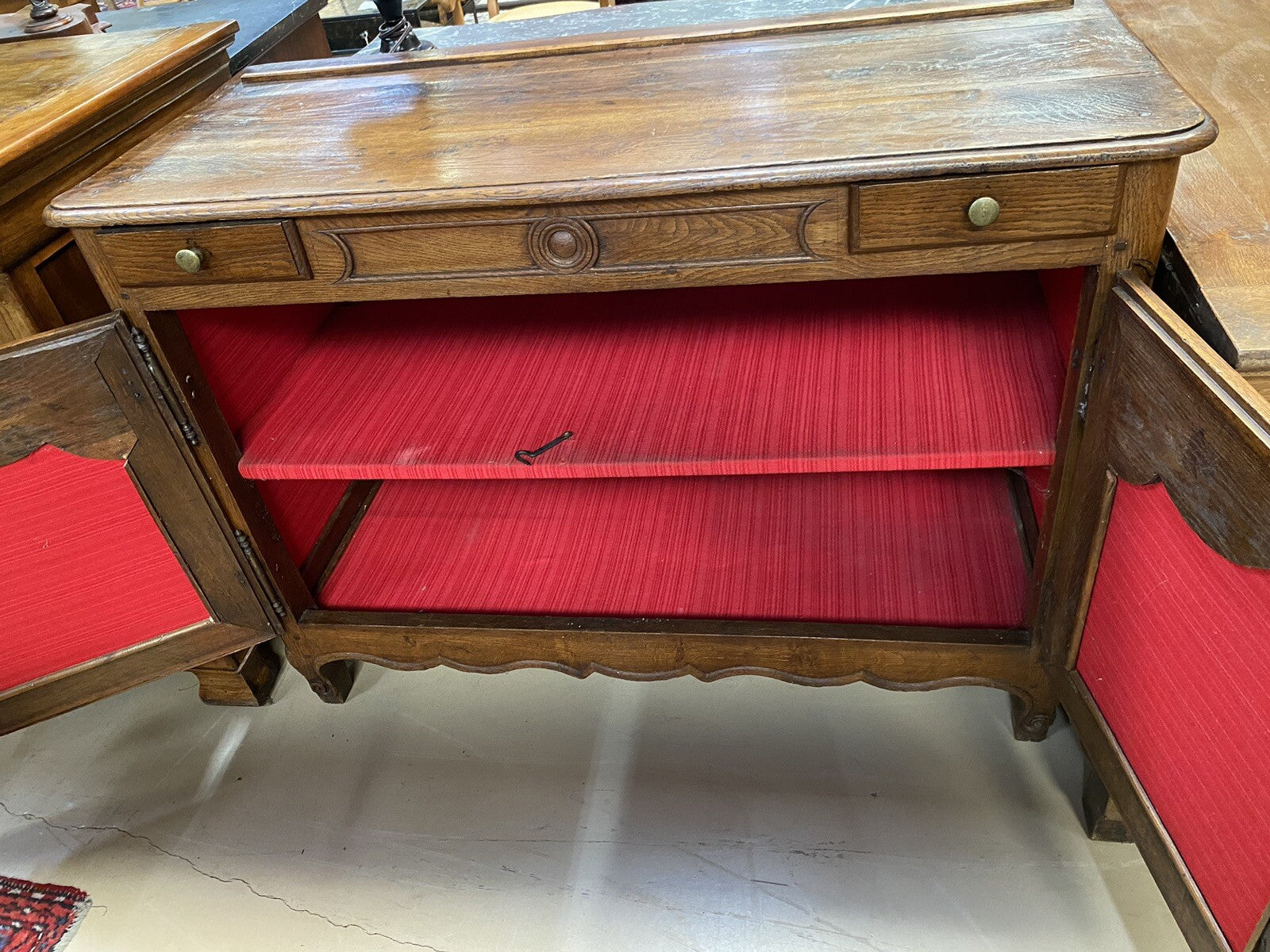 French Provincial Louis XV Style Carved Oak Sideboard, 19th c., the rounded corner top with a rear dish ledge, above two small frieze drawers, over double cupboard fielded panel doors, with iron escutcheons and hinges, flanked by fielded panel sides, over a shelved interior, on scrolled cabriole legs joined by a serpentine skirt.