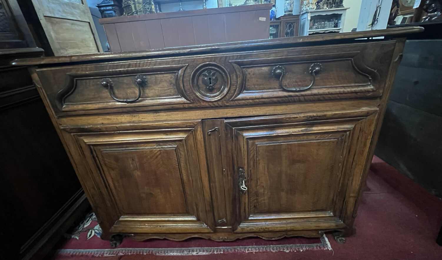 FRENCH PROVINCIAL LOUIS XV SIDEBOARD, 18th c., the rectangular top over a single wide drawer, above two cabinet doors, rising on short scrolled feet, approximately 38"h, 51.5"w, 22.25"d