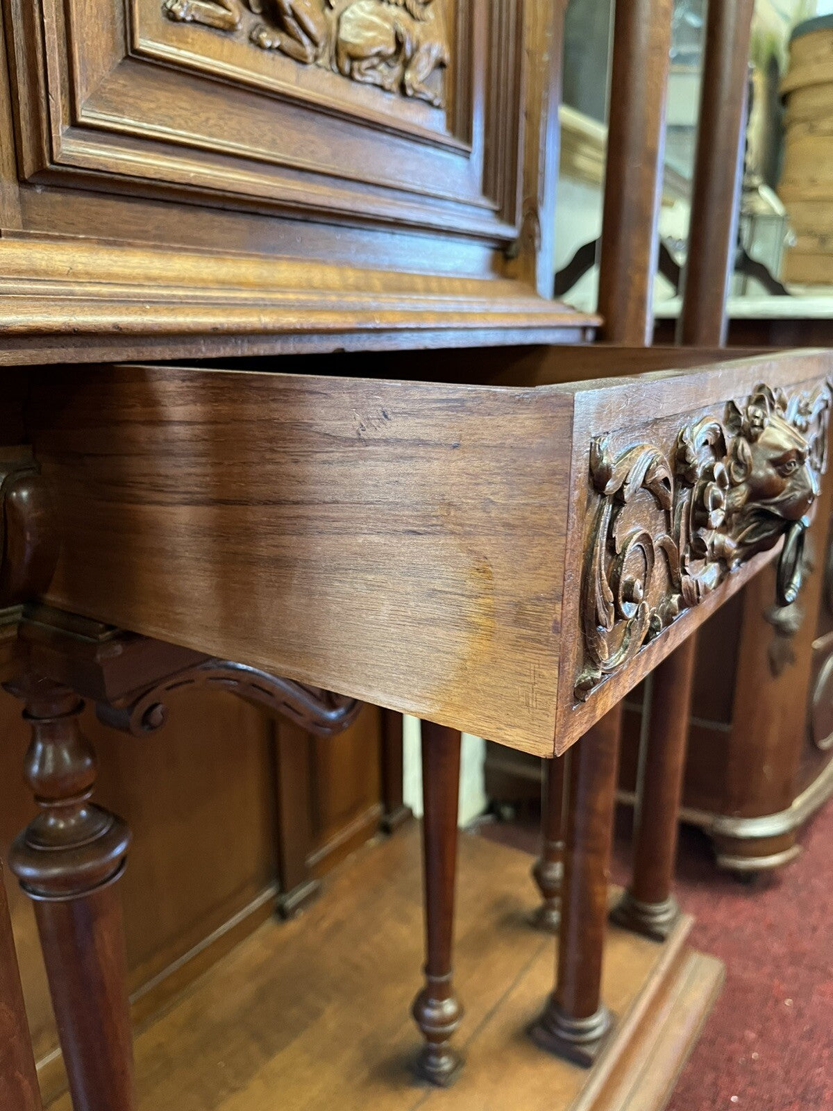 Antique French Renaissance Revival walnut cabinet or cupboard, 19th c., molded cornice, architectural facade, centered cabinet door carved with a naiad, above a small drawer, turned column supports, paneled backboard, on bun feet