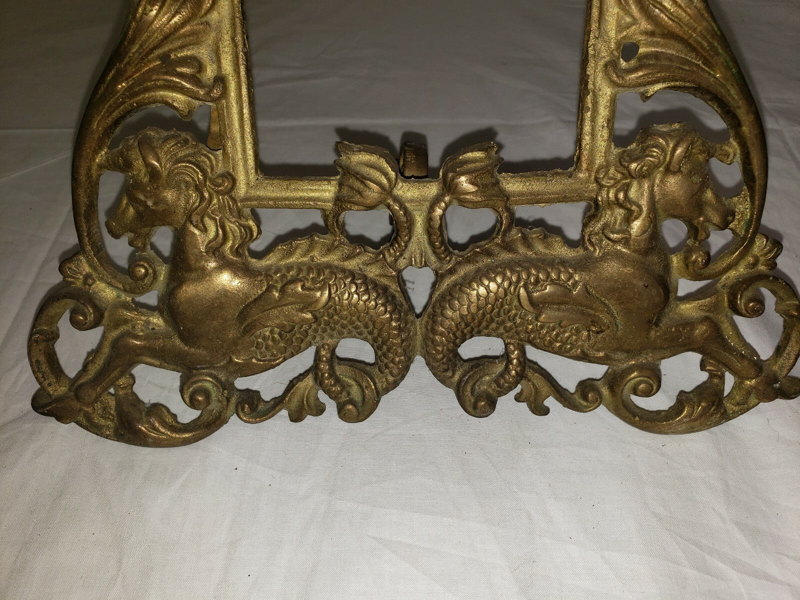 Offered for sale is an antique gilt cast iron picture frame that holds a 4 x 6" image. The overall picture frame measures H 13.5" x W 10". It has 3 musical cherubs at the top with cornucopia on the sides . The bottom is 2 sea horses or hippocamus-a mythological creature. A swivel easel supports the frame that weighs 3 lbs 2 oz. This is a rare find in such great condition. We bought 10 picture frames from the same collector-check out our other eBay listings.