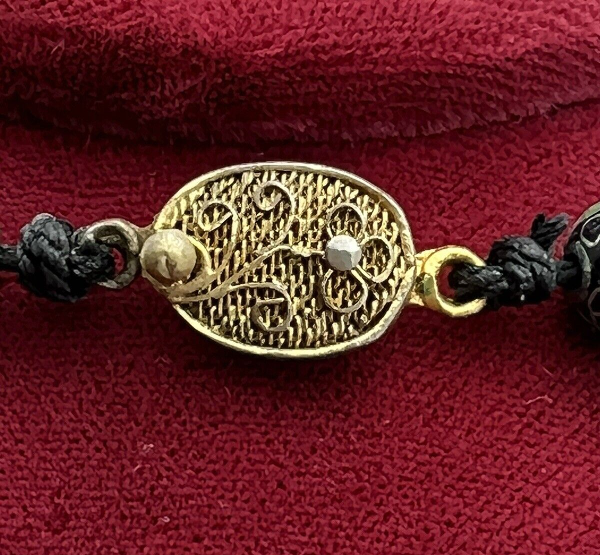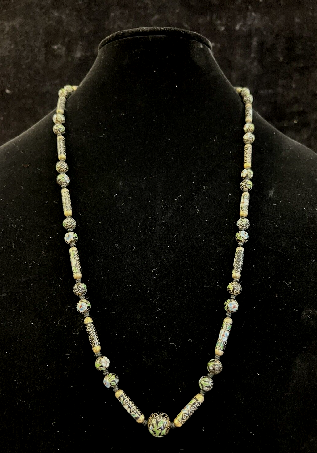 Antique Handmade 30" Cloisonne Necklace Hand Painted Black Enamel Floral Design.