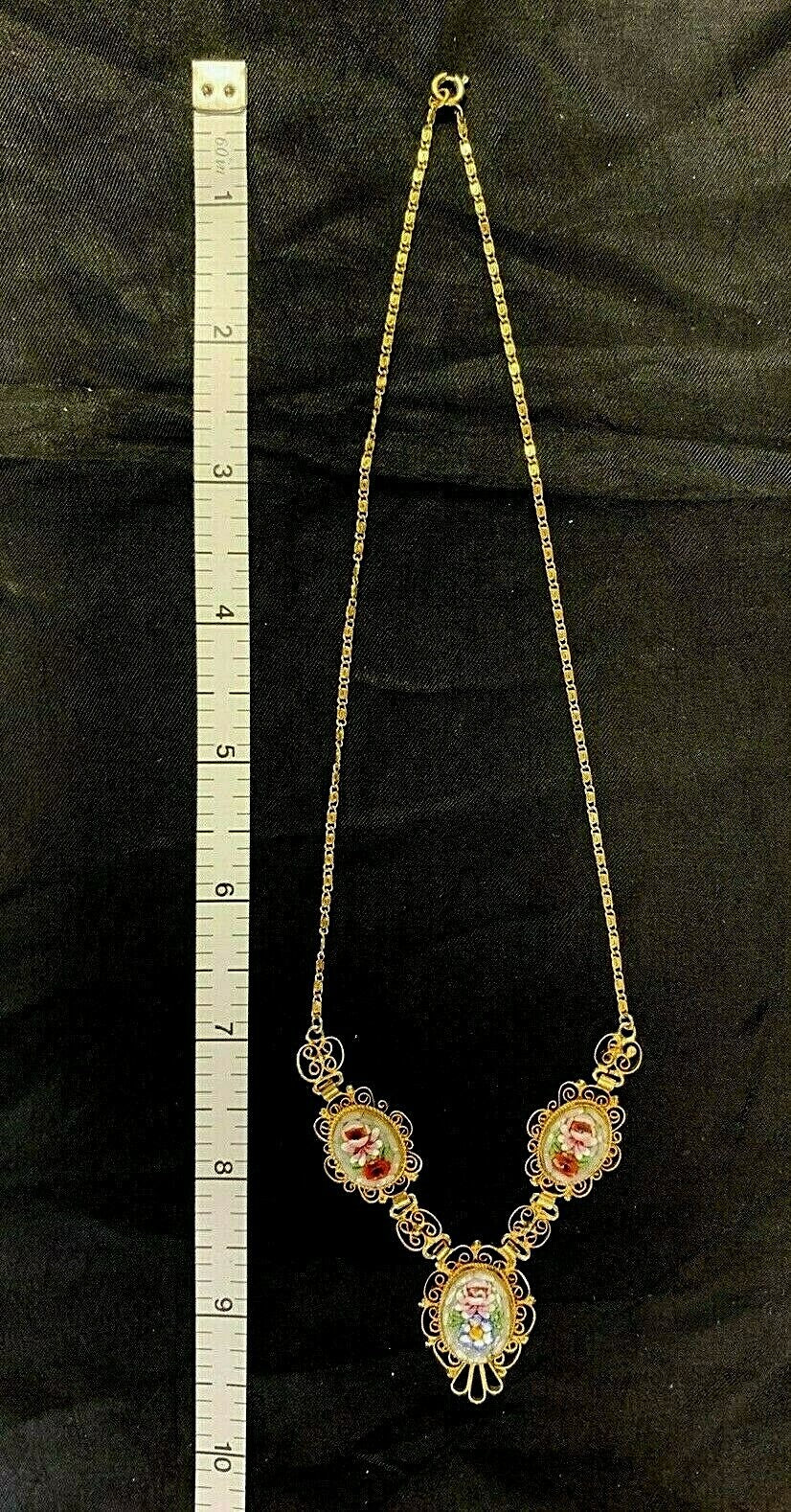 Offered for sale is an Italian antique filigree 18" pendant necklace with 3 micromosaic floral medallions. All the small glass pieces-tessarae- were place meticulously by hand in the brass base, The pieces are beautifully connected by detailed gold filigree. I believe the chain was lenghtened to 18" overtime as the chain design changes. The circle closure works fine. Overall, great condition and signed Italy on the middle medallion. An overall beauty-get ready for compliments! Check out our other micromosaic listings on eBay.