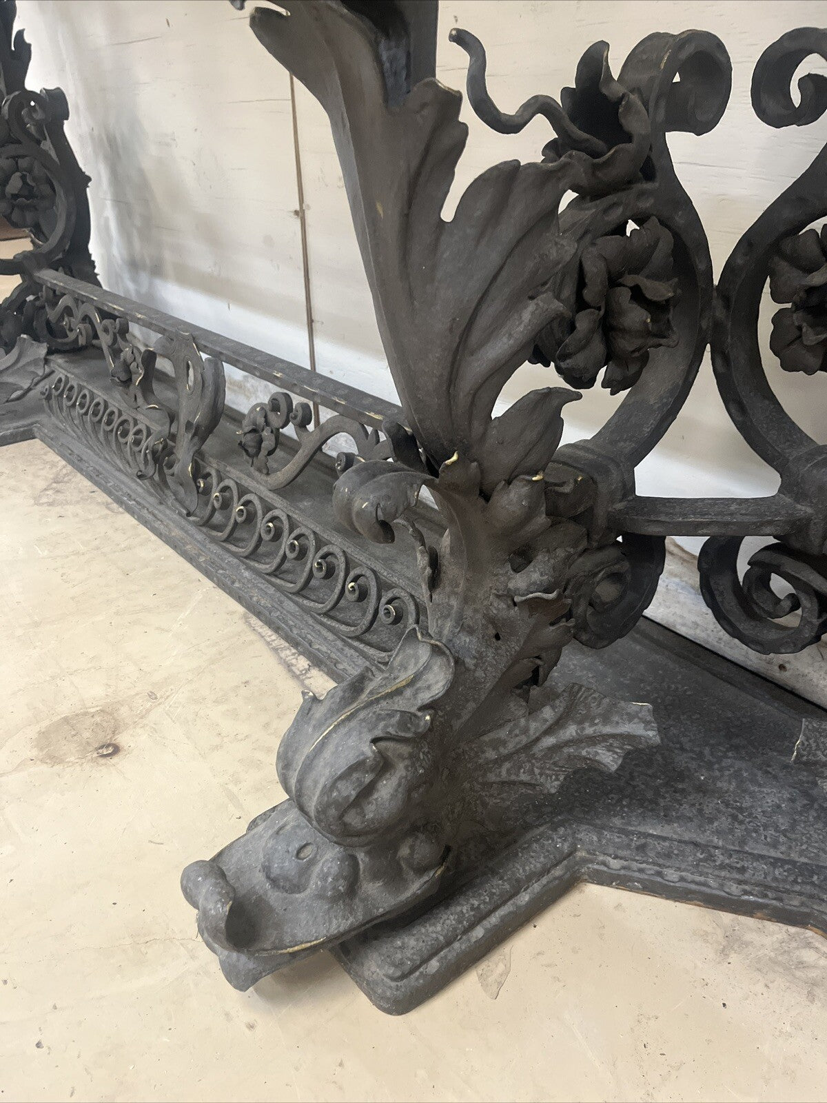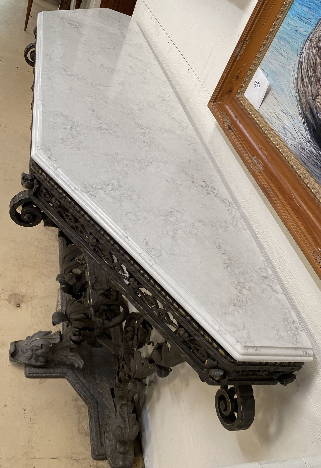 Venetian style wrought iron console table, early 20th century, with newly cut quartz white and grey quartz top with over molding supported on a foliate motif band and raised on acanthus leaf legs with dolphin feet and a plinth base, apparently unmarked.