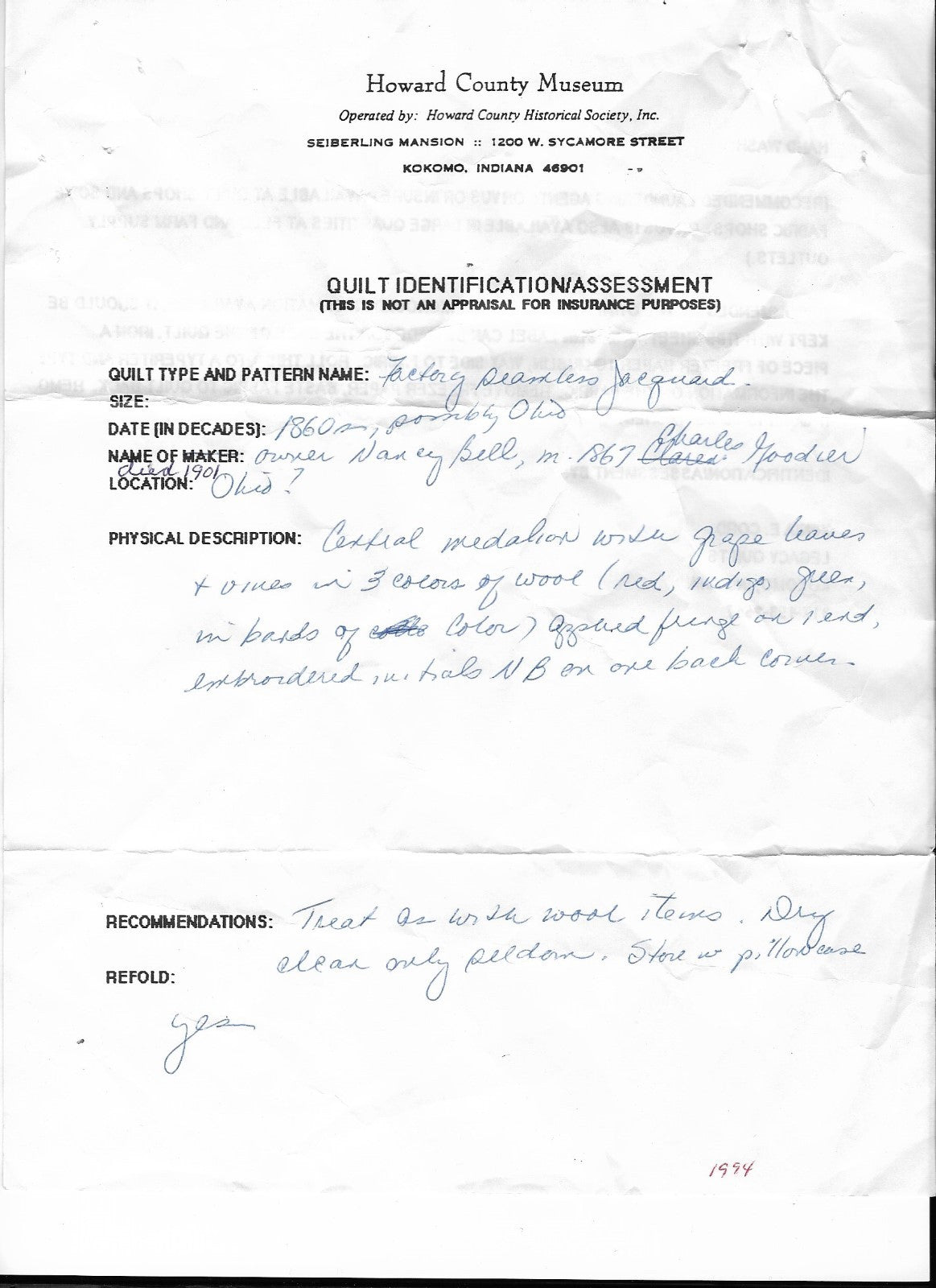 Offered for sale is an antique wool woven Jacquard coverlet with a central medallion with grape leaves and vines, woven in 3 colors of wool- red, indigo, green- in bands of colors. The corner is embroidered with the initials NB. An appraisal from an Indiana museum, as shown in the photos, estimates the age to the 1860's with an Ohio provenance. The coverlet measures 85" x 74" including the fringe. The coverlet is in excellent condition-no holes or stains. It has beautiful colors with fringe on 3 sides.