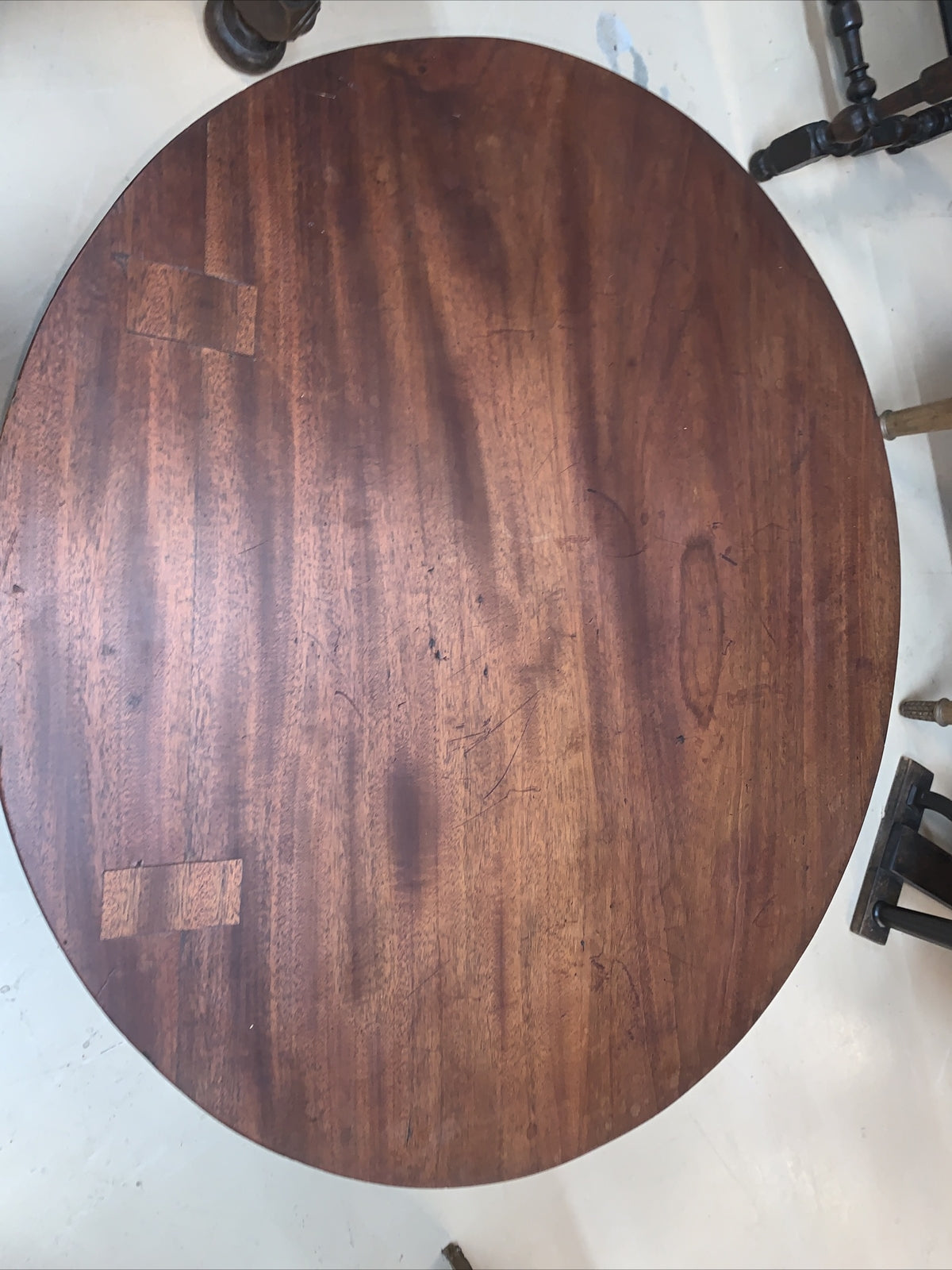Has 2 original patches to cover the checks in the mahogany wood. Small split on one edge.