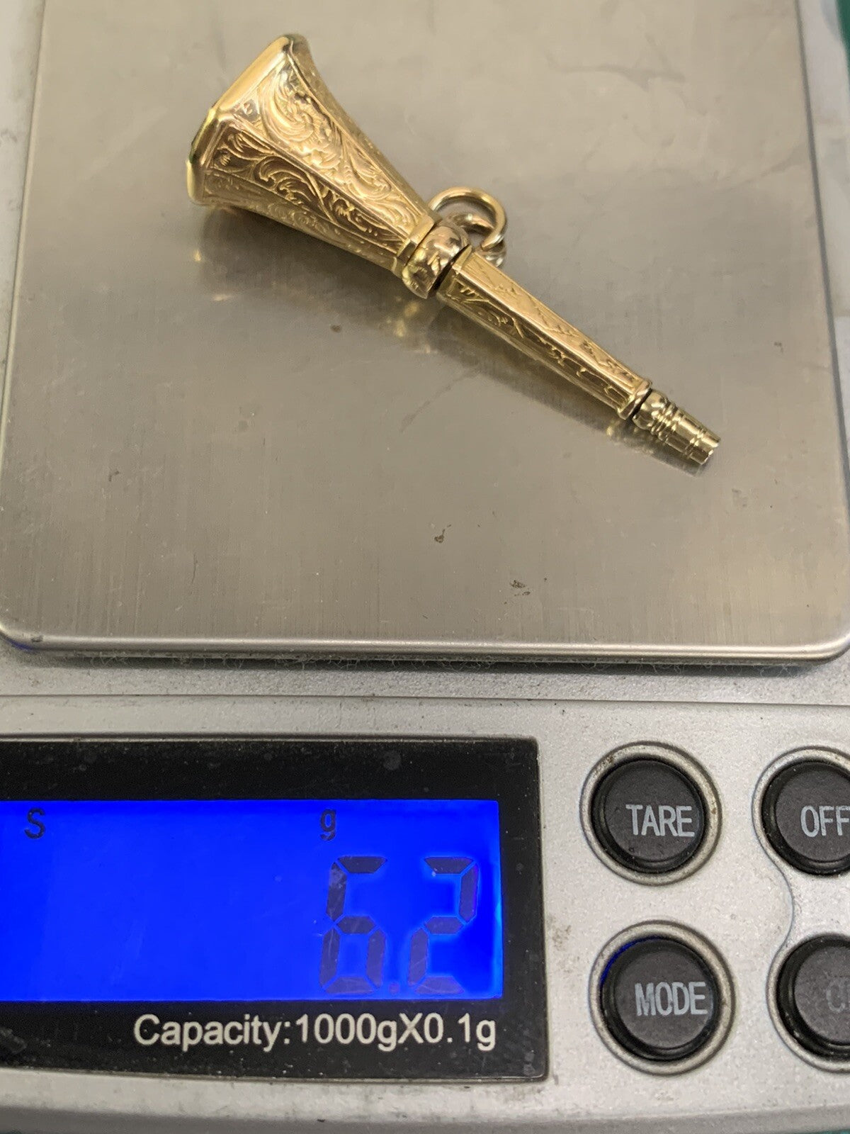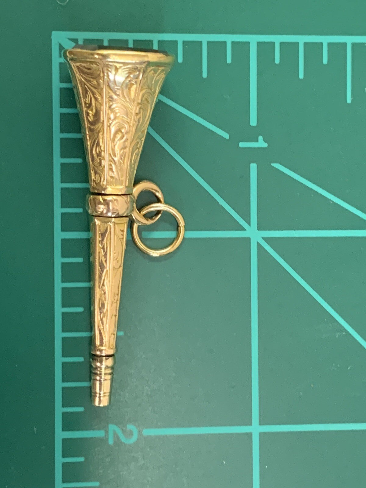 Offered for sale is an antique Victorian watch key, yellow gold shell over a metal core, with beautiful chasing work. Very minor wear only visible under the loupe. Set with a bloodstone that is in great shape and is uncut. Measures 1 75" long by a shy under 1/2" diameter, weight a nice 6.2 grams. Free domestic shipping.
