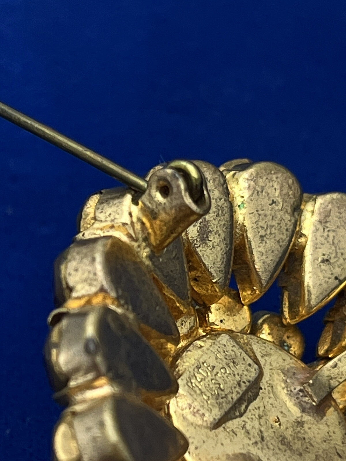 This amazing vintage pin is goldtone with topaz and lime green rhinestones around a vriegated cabochon domed. It is 1.5". It has 2 bails so that it can be worn as a necklace.Gorgeous piece!