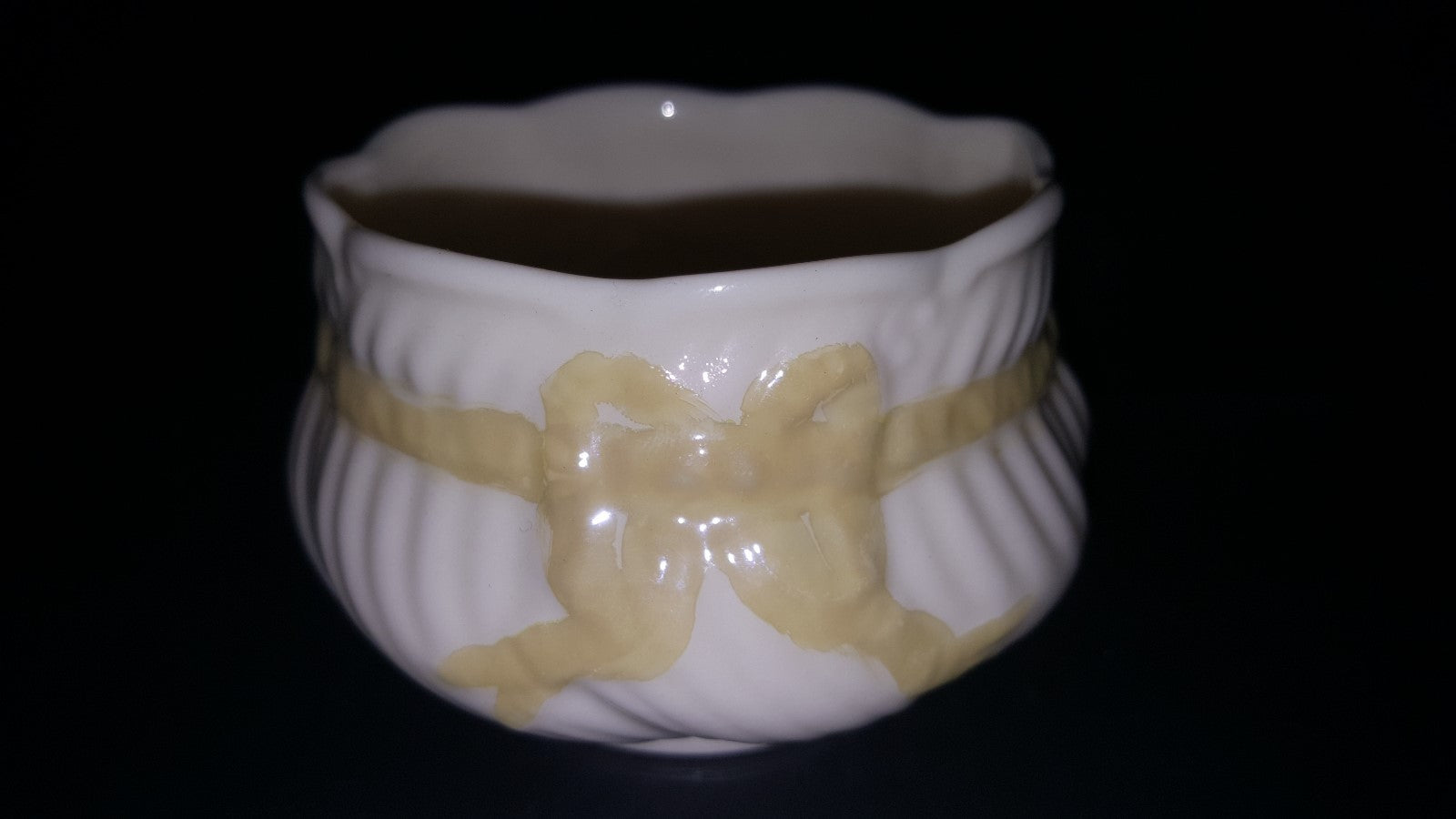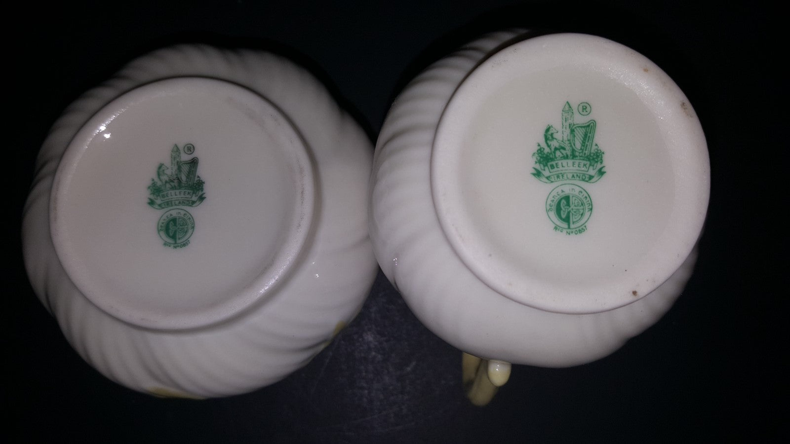 BELLEEK IRISH YELLOW RIBBON OPEN SUGAR BOWL & CREAMER 3rd GREEN Mark1965-80