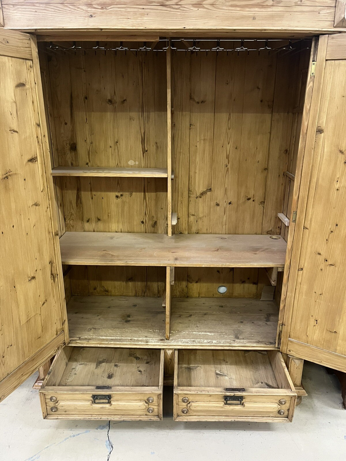 Central European carved pine armoire, late 19th c., molded cornice, turned pilasters, pair of paneled doors centered by a boss, now on double hinges, the interior fitted as a bar, two exterior drawers below, on bun feet