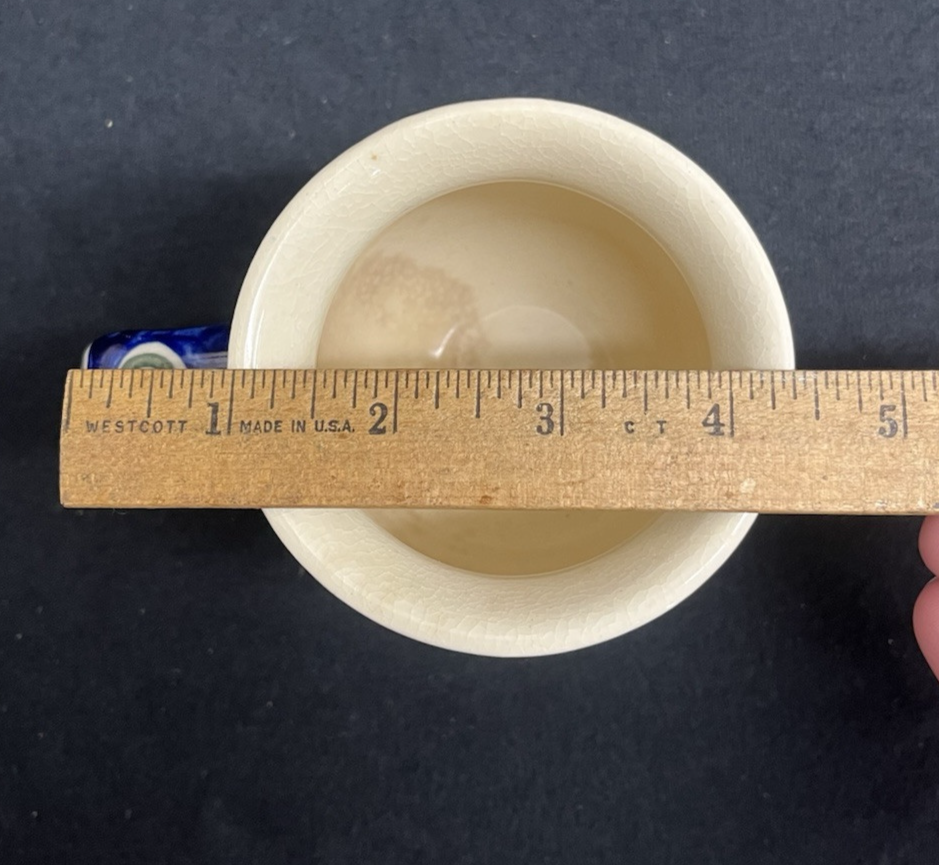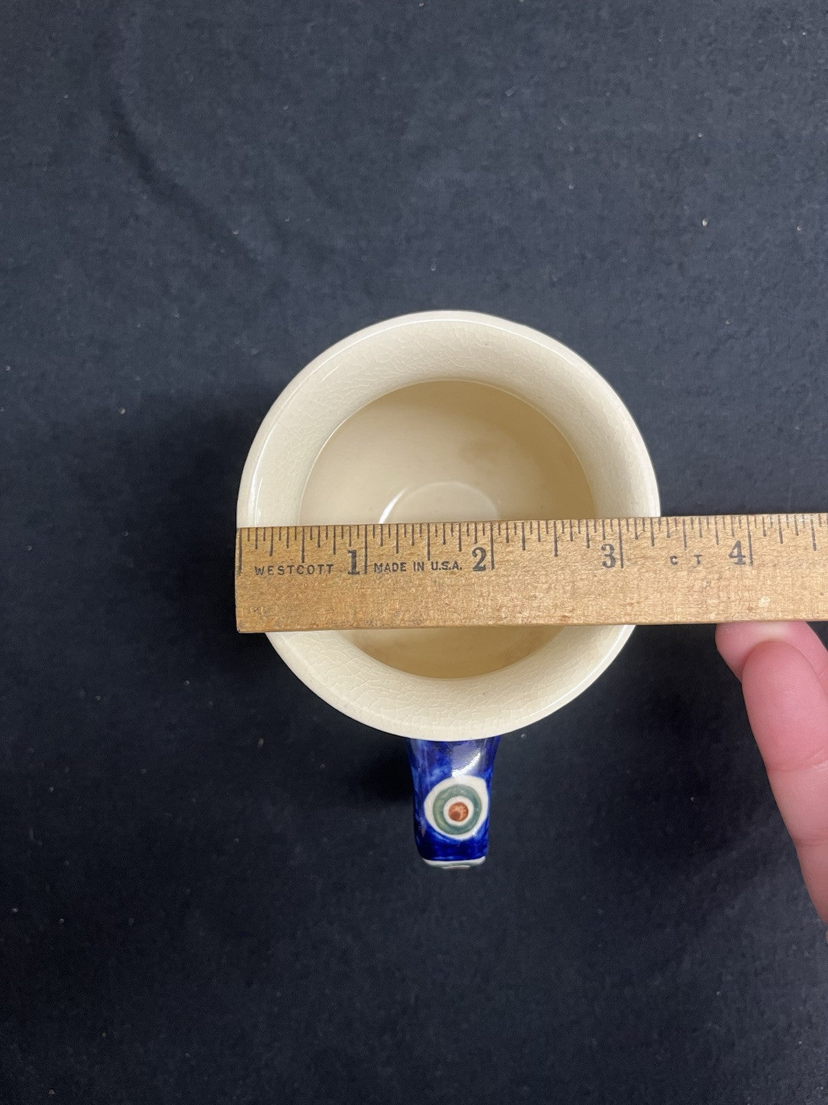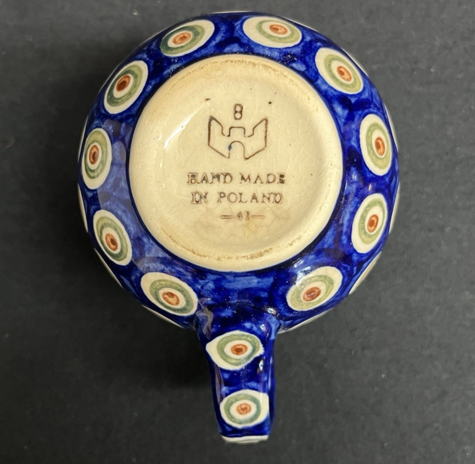 This is a handmade Boleslawiec Polish Pottery Belly Mug featuring a Peacock pattern. The mug is 3.5 inches in diameter and made of glossy blue pottery from Poland. It has a traditional design with a glossy finish, perfect for enjoying your favorite beverages. We have 6 mugs available. Excellent condition.