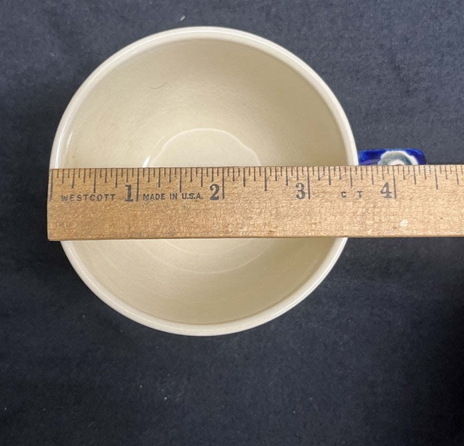 This is a handmade Boleslawiec Polish pottery flat cup in a traditional blue pattern. It has a diameter of 3.625 inches and a height of 2.5 inches, made of pottery in Poland using traditional techniques. Perfect for serving hot beverages in a charming and authentic style.