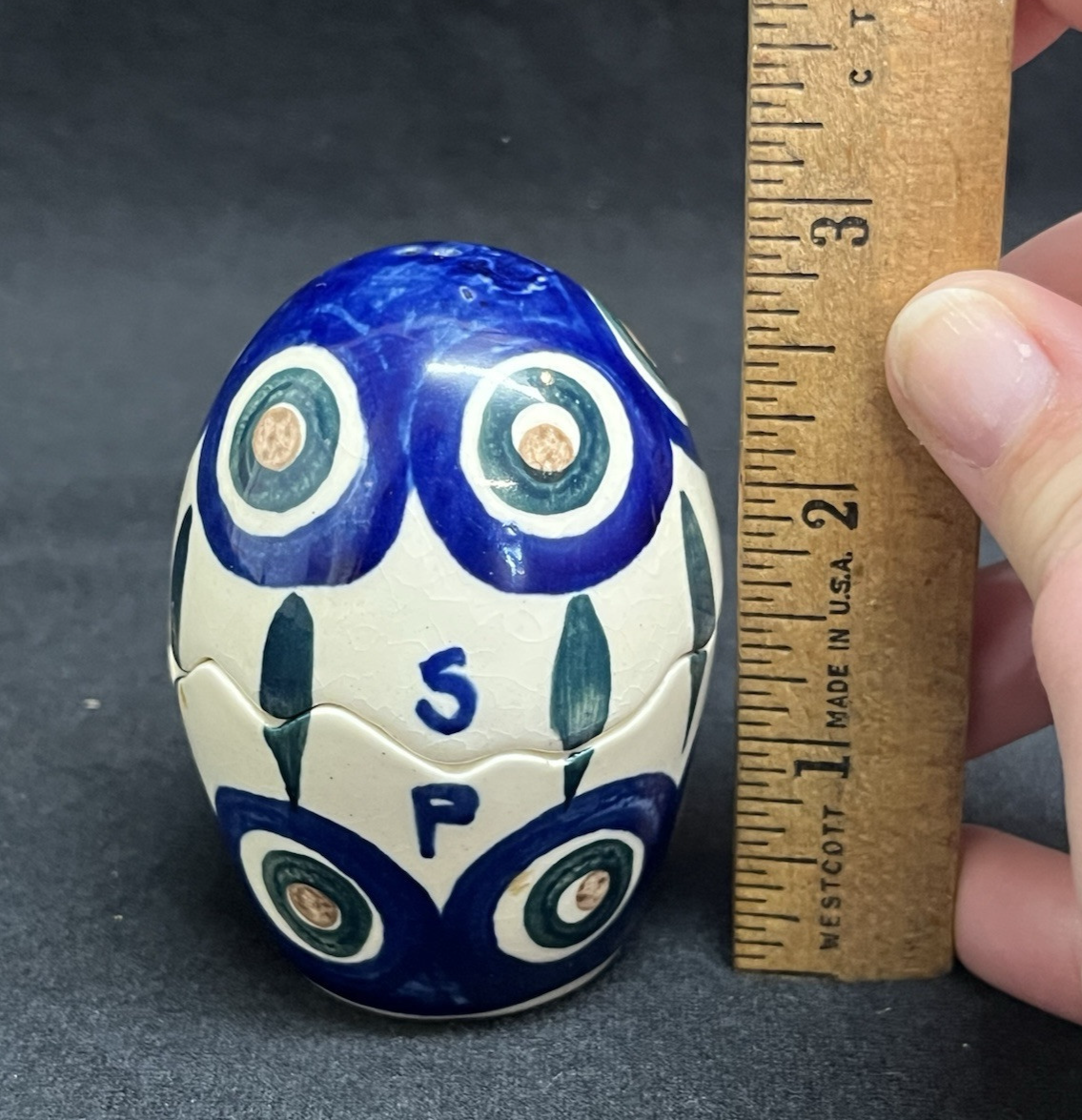 The Boleslawiec Polish Pottery Stackable Salt & Pepper Shakers feature a Peacock pattern on glossy blue pottery. Handmade in Poland, they have an egg shape with a 2-inch diameter and 3-inch height. These decorative shakers are ideal for adding a touch of charm to your dining table.