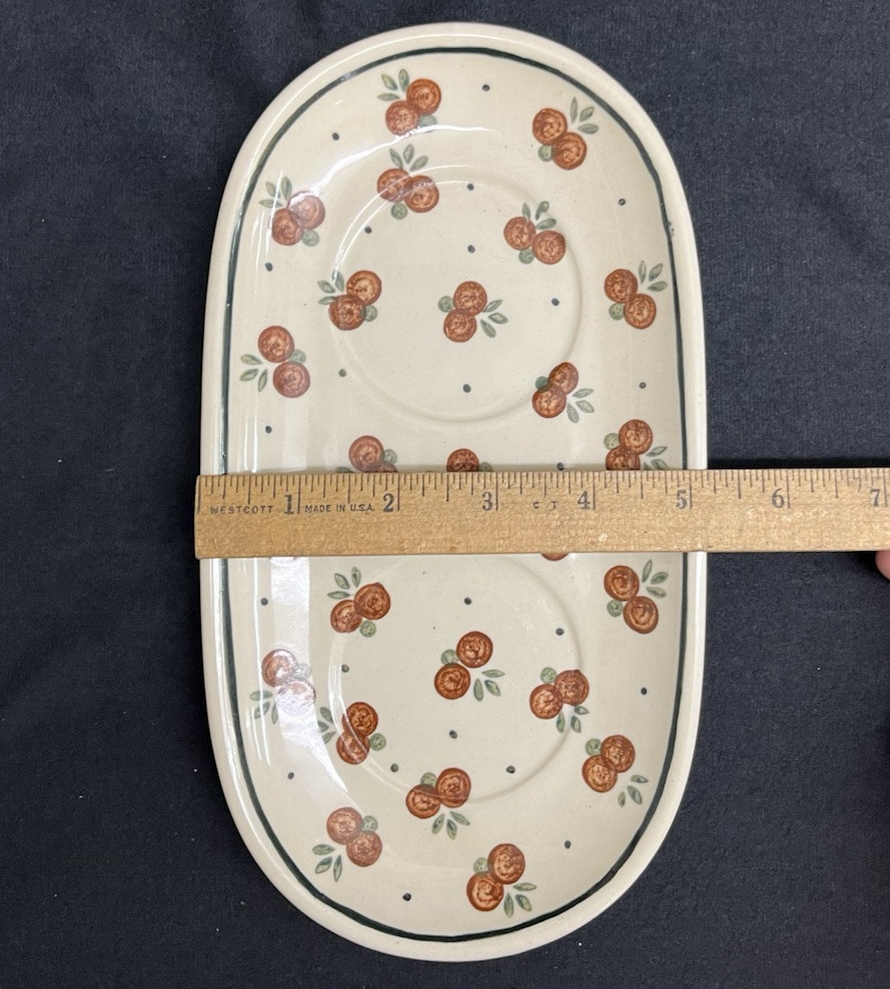This Boleslawiec Polish Pottery Sugar Bowl and Creamer Set in Wild Cherry pattern includes a tray. The sugar bowl is 4 inches high and the creamer is 3.06 inches high. The set is made of pottery with a glossy finish and is handmade in Poland. The tray measures 9.5 inches in length, 5.25 inches in width, and 1 inch in height. The sugar bowl has a length of 4.75 inches and a diameter of 3.75 inches, while the creamer has a length of 3.75 inches and a diameter of 3 inches.