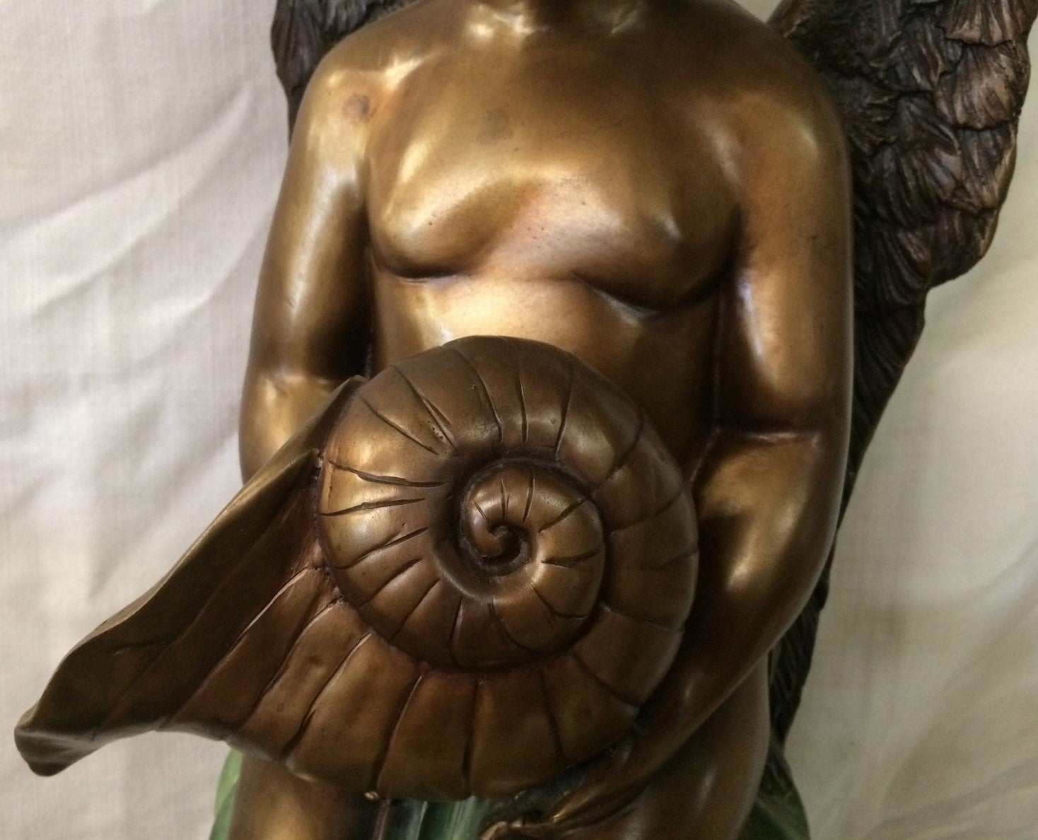 Offered for sale is a Bronze Angel / Cherub holding a conch shell. This fountain is made with bronze in the lost wax method. It weighs 17 lbs and can be connected to water and used as a fountain or just sculpture. It has tubing-just add the pump. Water would flow from the shell. You could set the whole thing in a large bowl and elevate the angel so that it looks like it is floating.It's in excellent condition & measures 27'' tall by 10'' wide by 10'' deep.