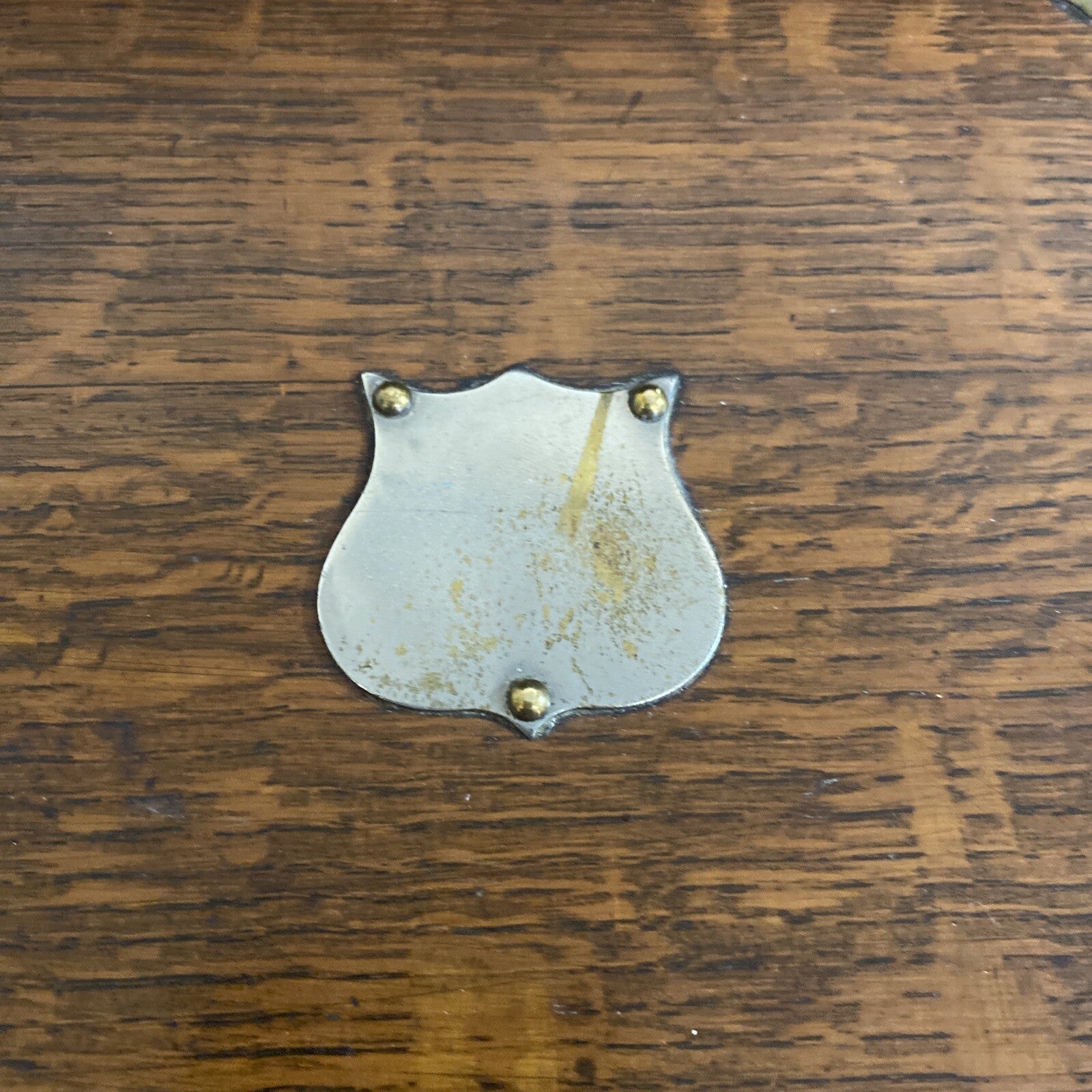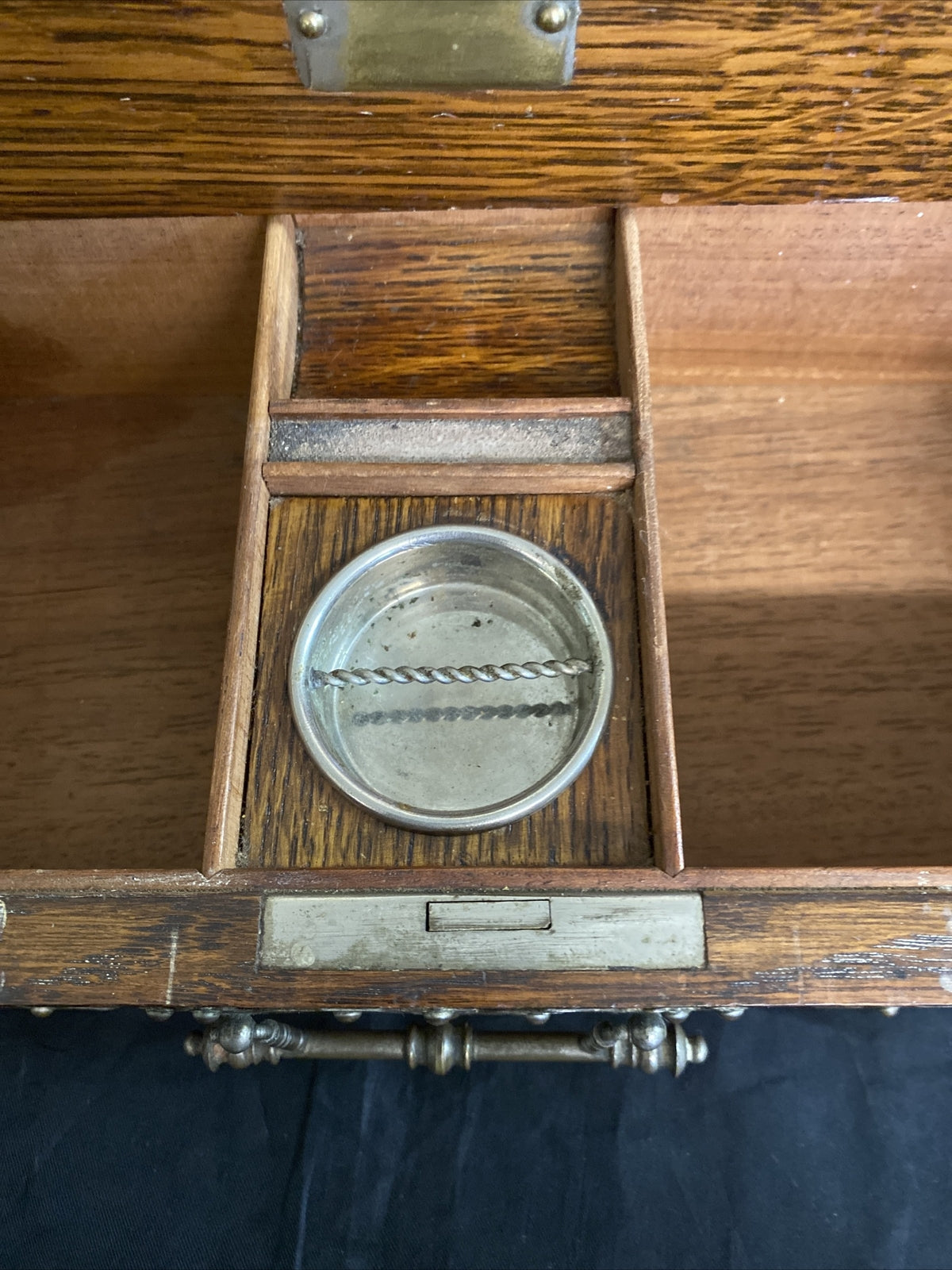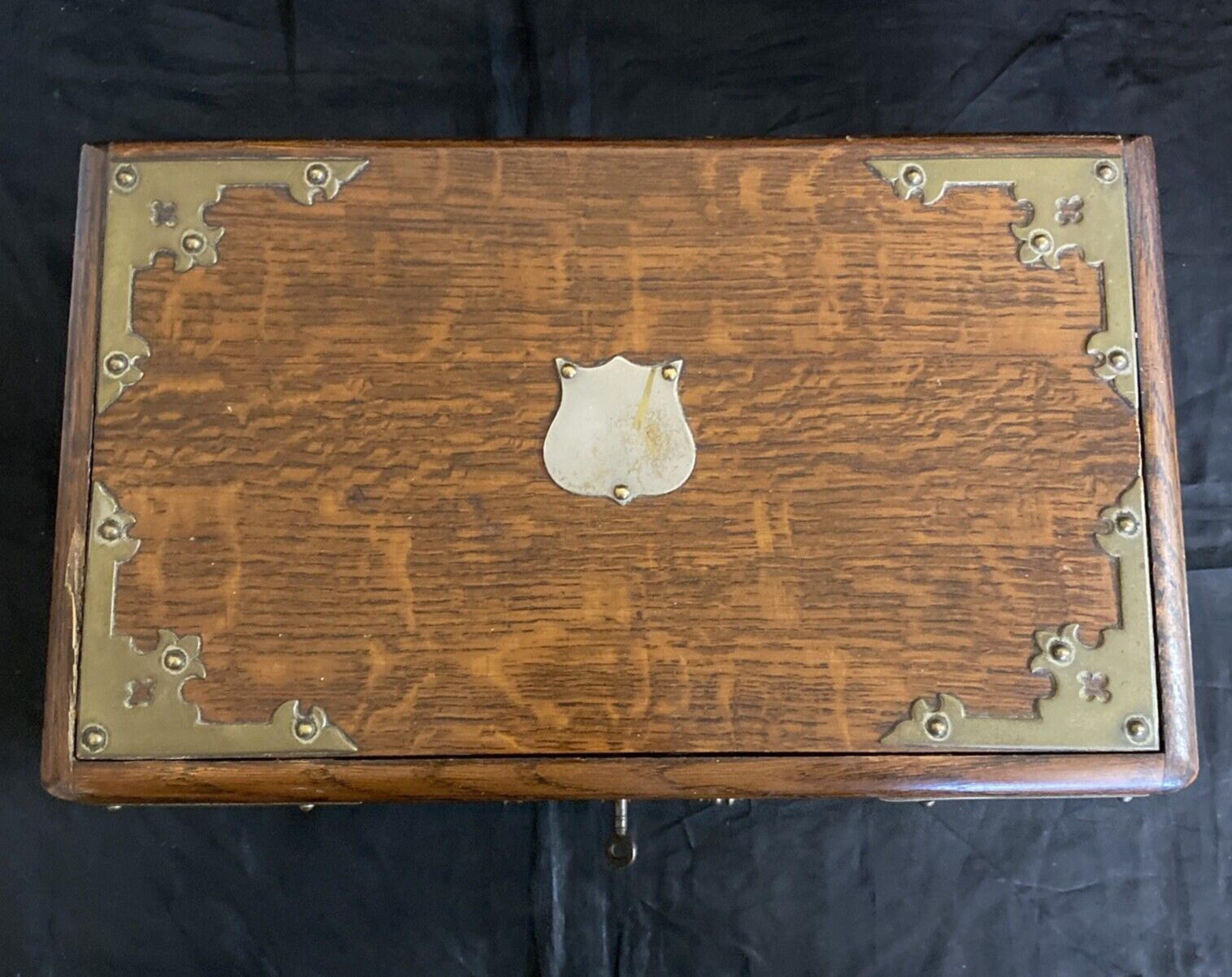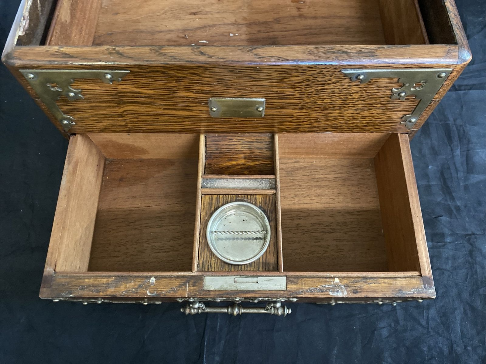 English Edwardian oak table box, early 20th c., rectangular case with mounted gilt metal strapping and handles, top panel centering shield-form cartouche, opening of lower drawer triggers rise of hinged top panel revealing open interior, drawer compartmentalized with central metal ashtray.
