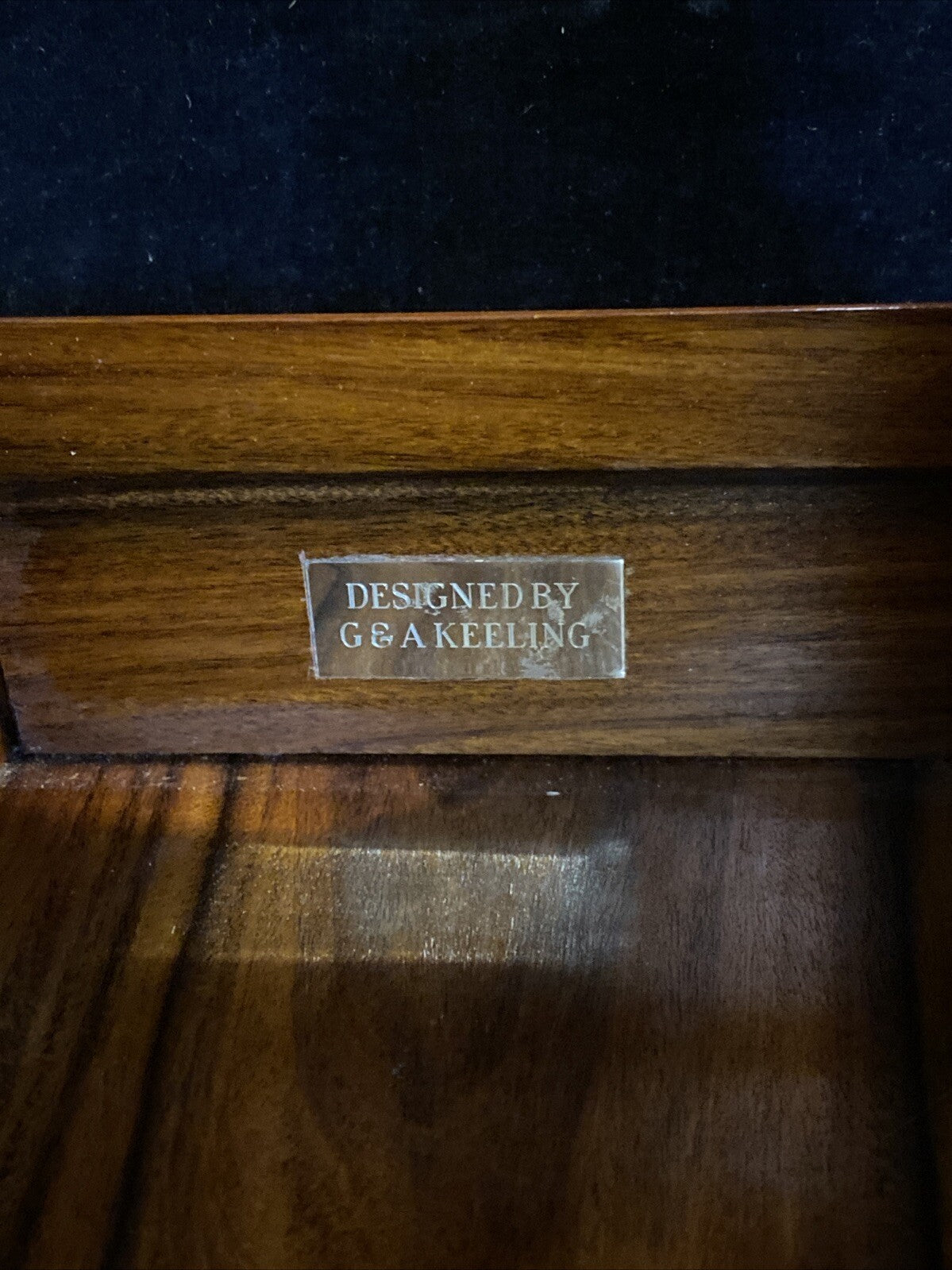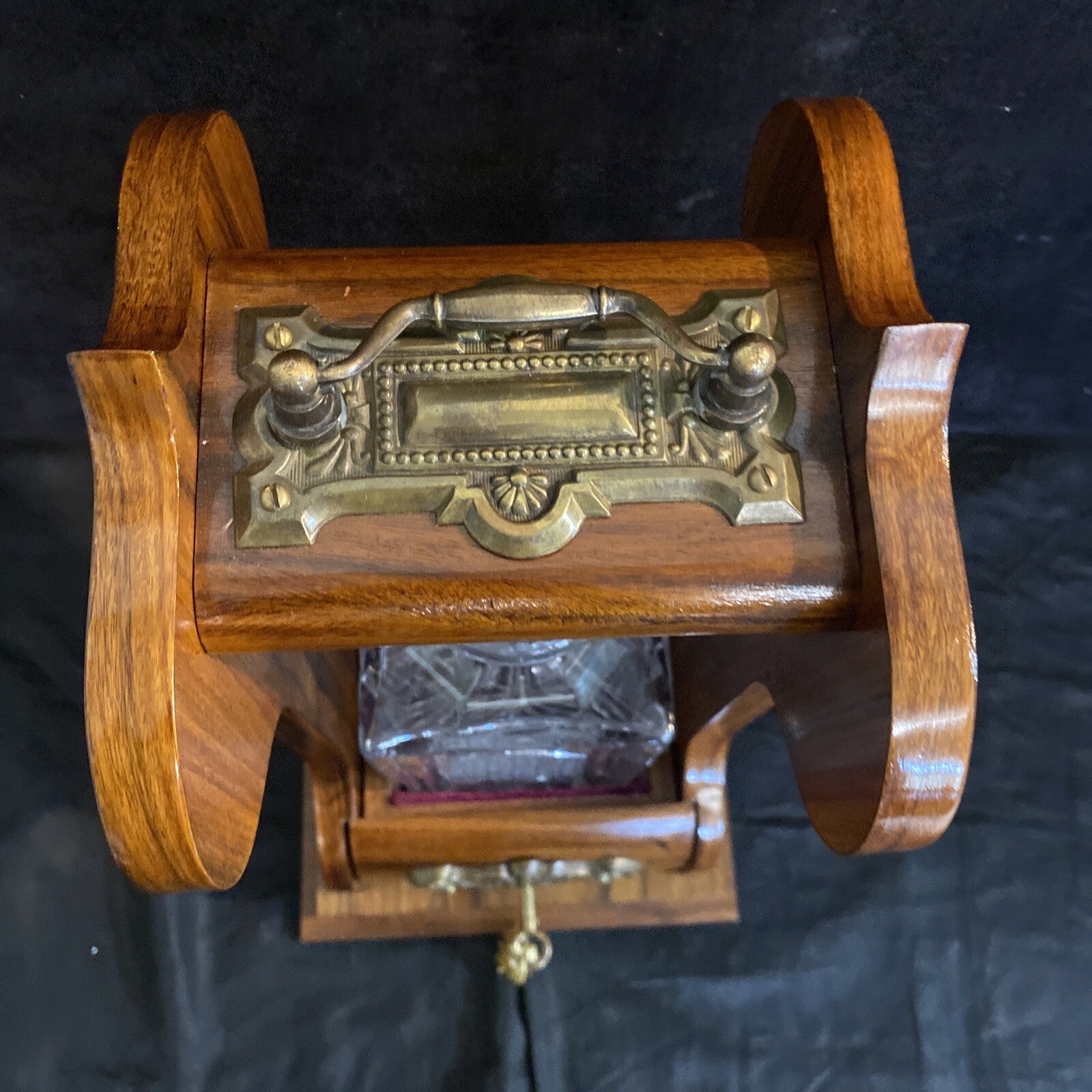From the late 20th c., rosewood frame with brass mounts, single sliding compartment with lock mechanism, square cut-glass decanter, and stopper, brass tag reading "designed by G & A Keeling," stopper with chip to end.