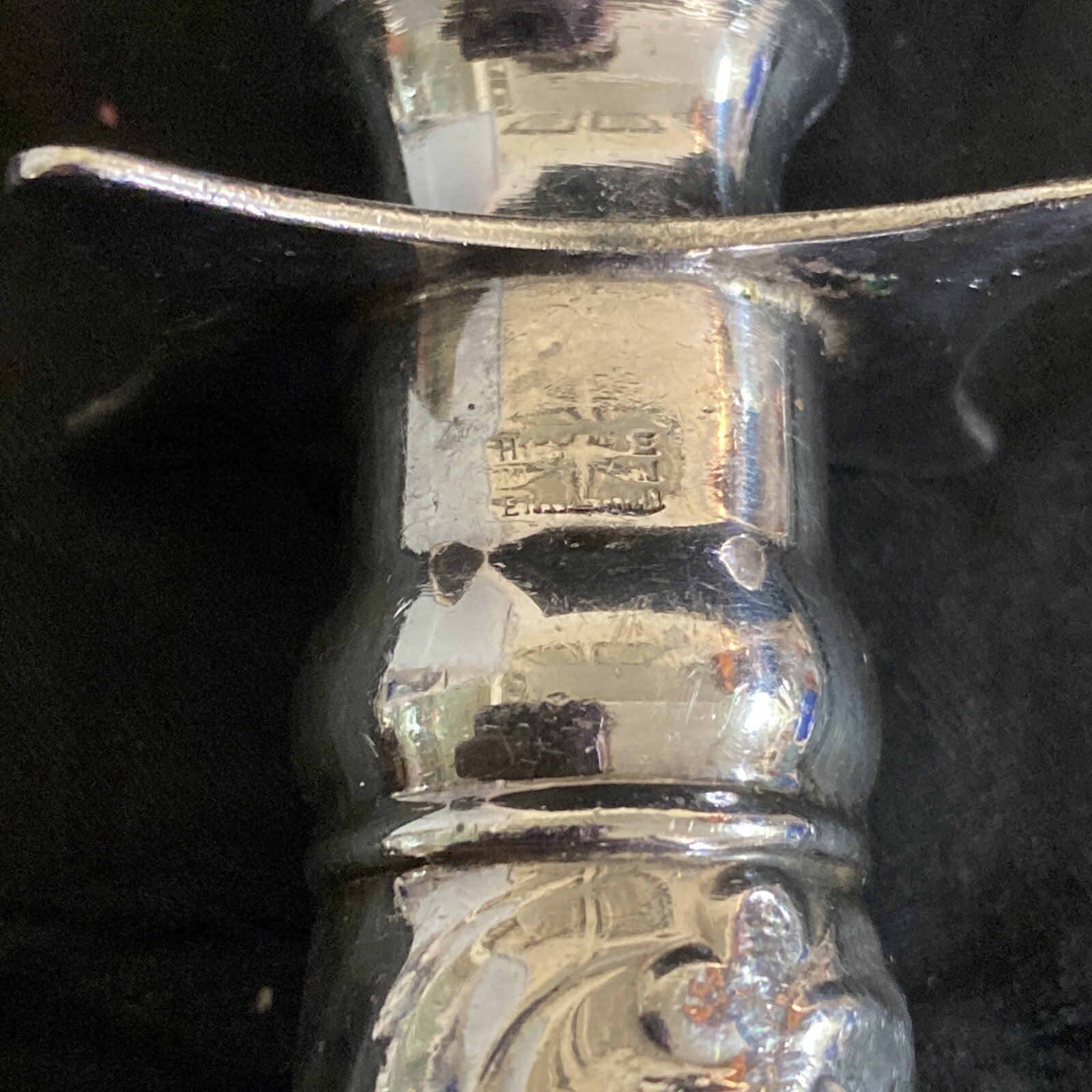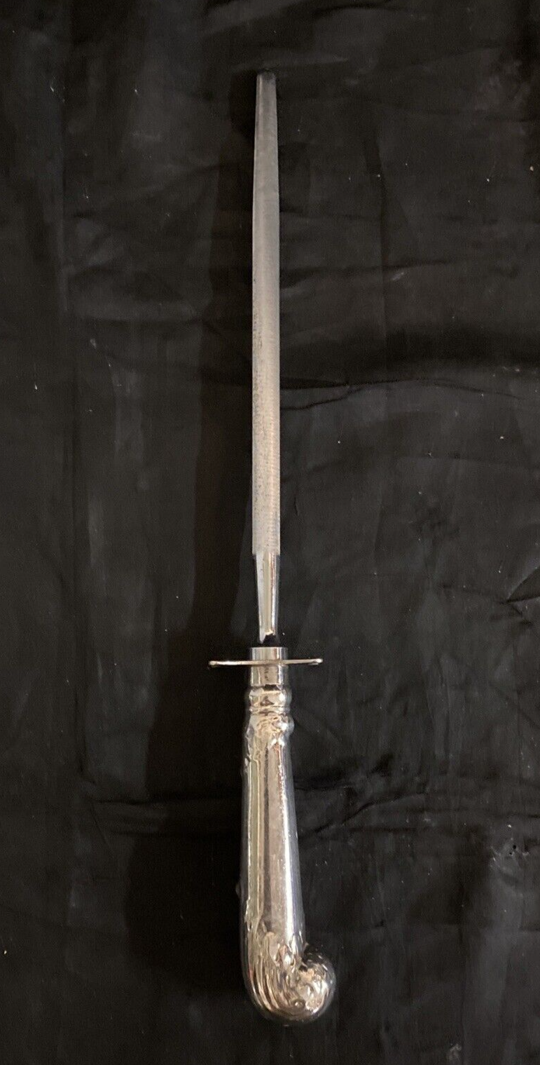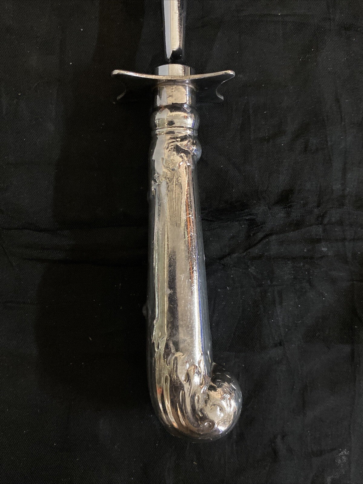 This English 3-piece carving set from the National Silver Co. Sheffield is a true Victorian gem. Crafted in silver plate, it boasts intricate details in a stunning presentation box. The set includes a knife, meat fork, and a sharpener.