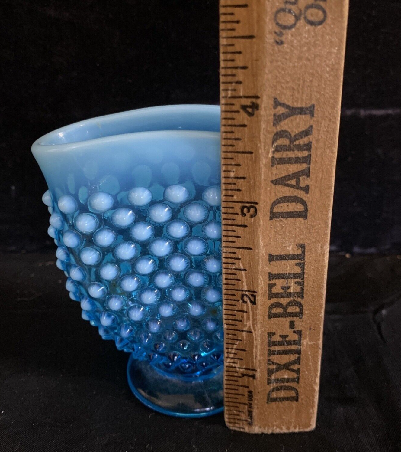 FENTON BLUE OPALESCENT HOBNAIL GLASS MINI FOOTED FAN VASE - CIRCA 1940 EXCELLENT