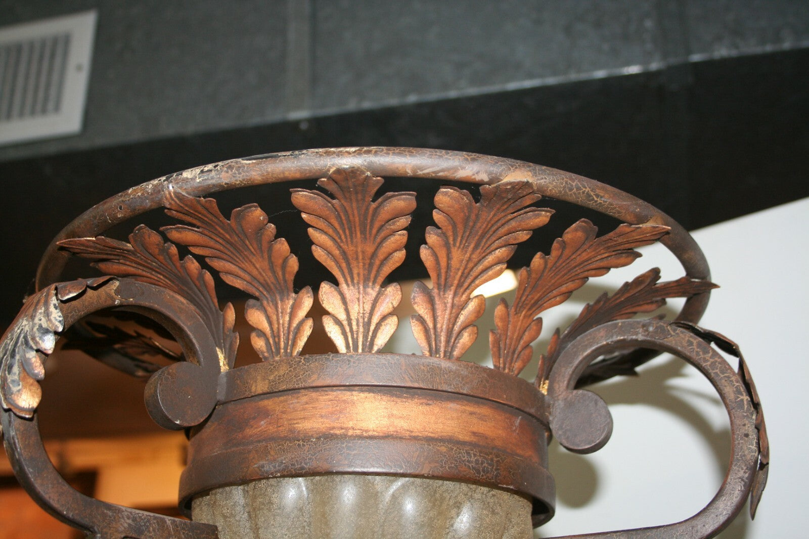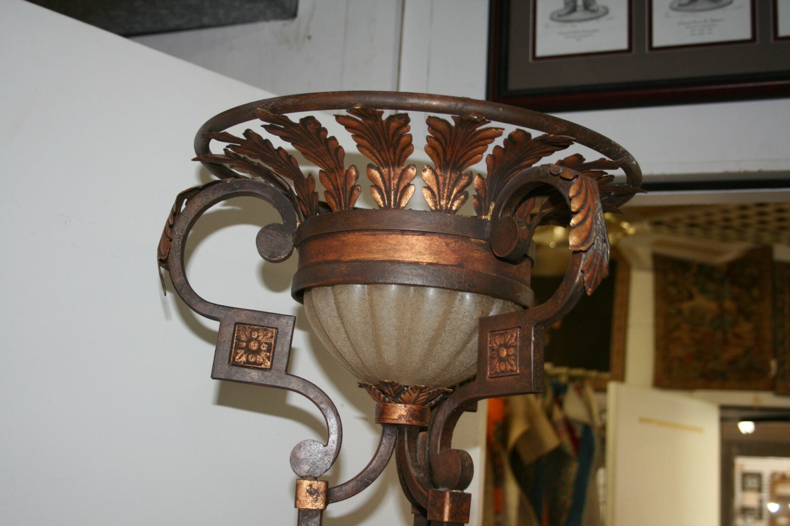 Original Retail $1895, elegant Fine Arts Transitional Iron torchiere with 3 handles around fluted single light globe ,acanthus leaves accents, bronze base, 3 iron stems. Excellent condition.